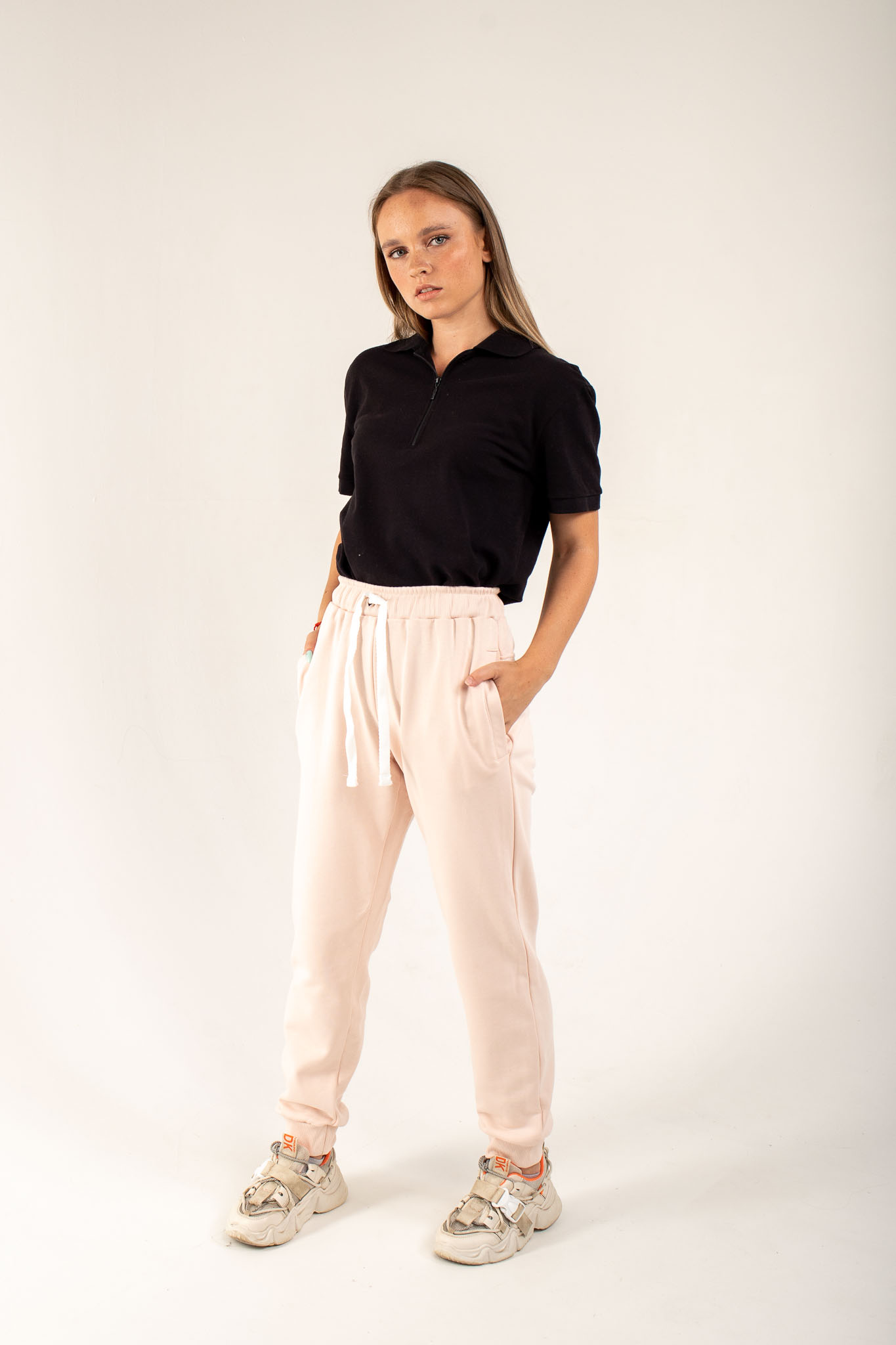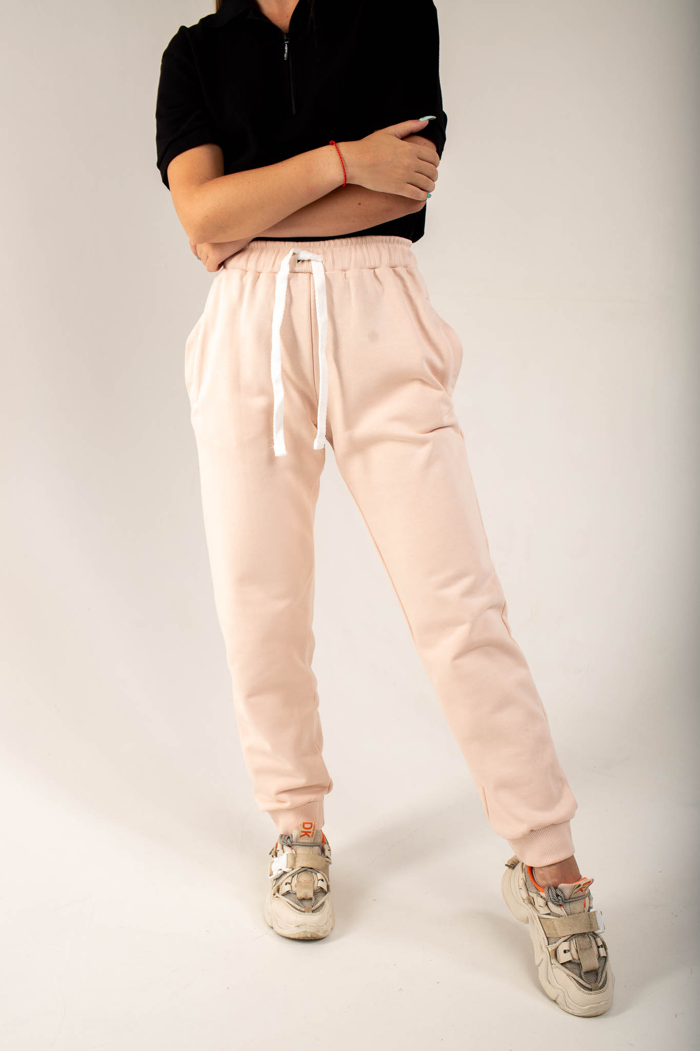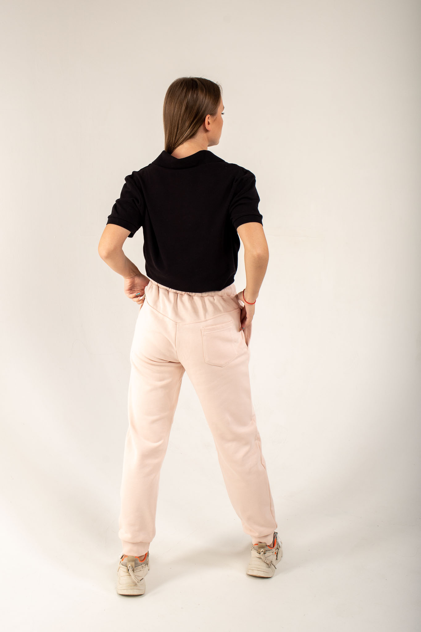 Женские штаны средней посадки, зауженные книзу, обладают прилегающим силуэтом. Пояс на резинке, притачной и простроченный на спецмашине, может быть со шнурком или без него.