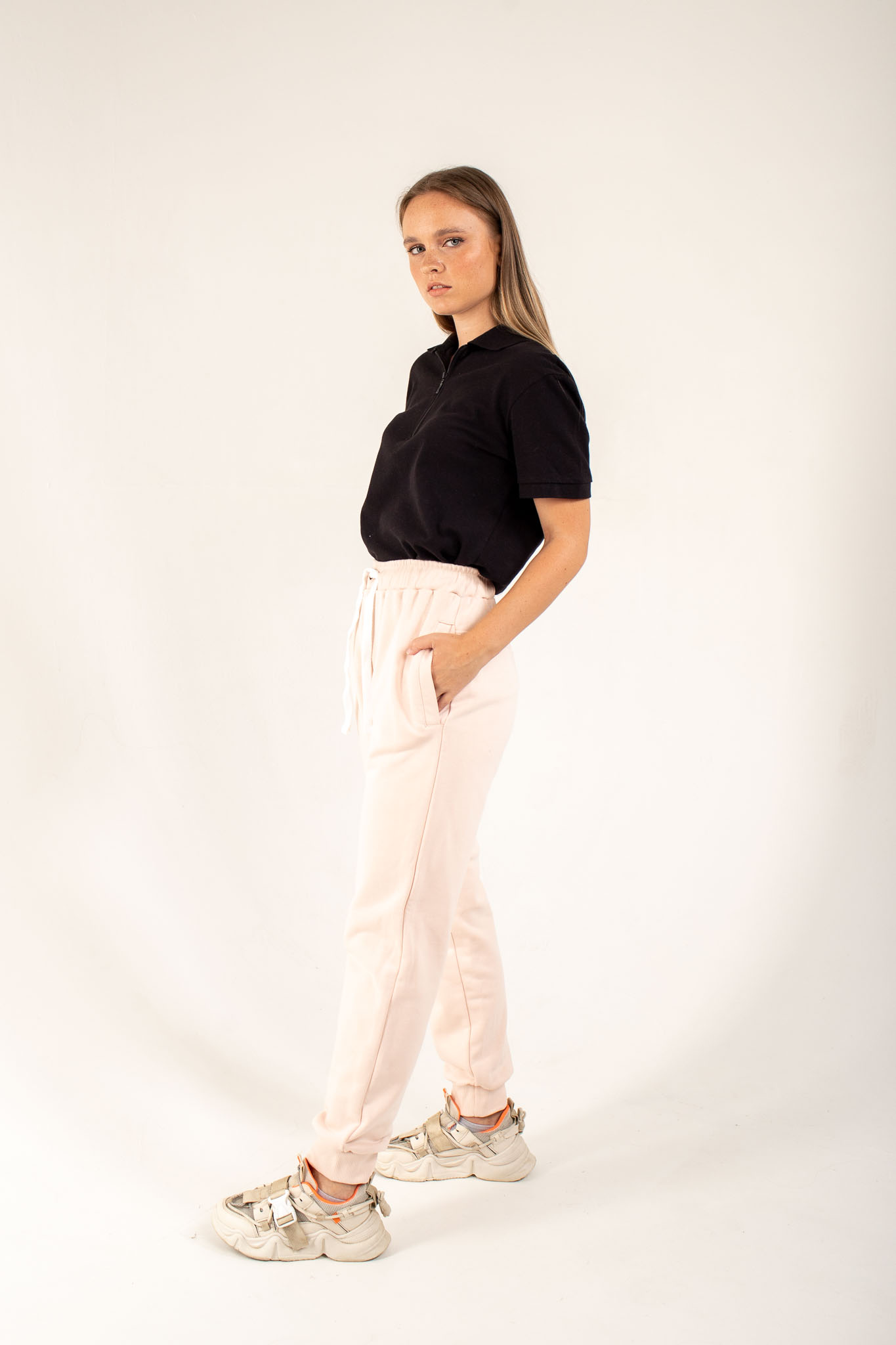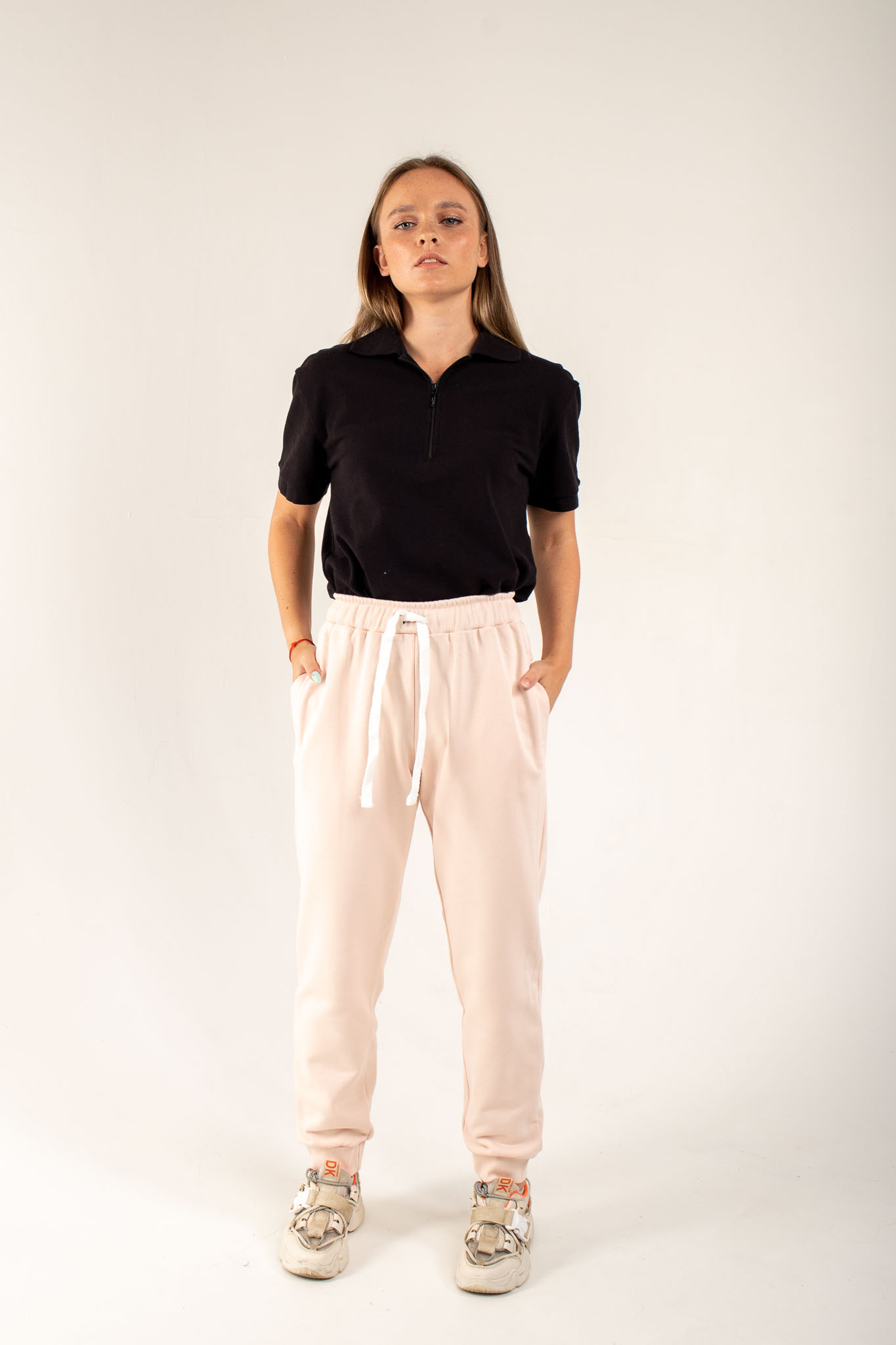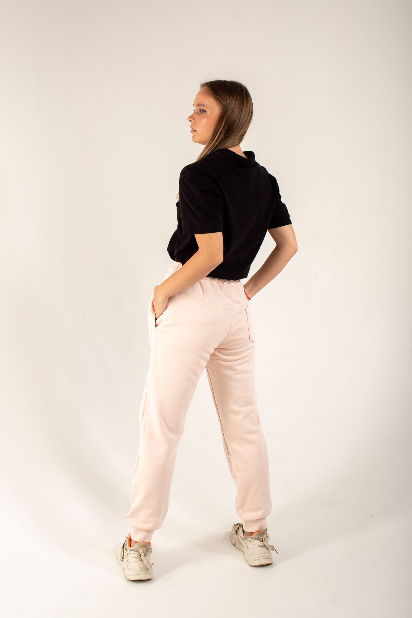Женские штаны средней посадки, зауженные книзу, обладают прилегающим силуэтом. Пояс на резинке, притачной и простроченный на спецмашине, может быть со шнурком или без него.