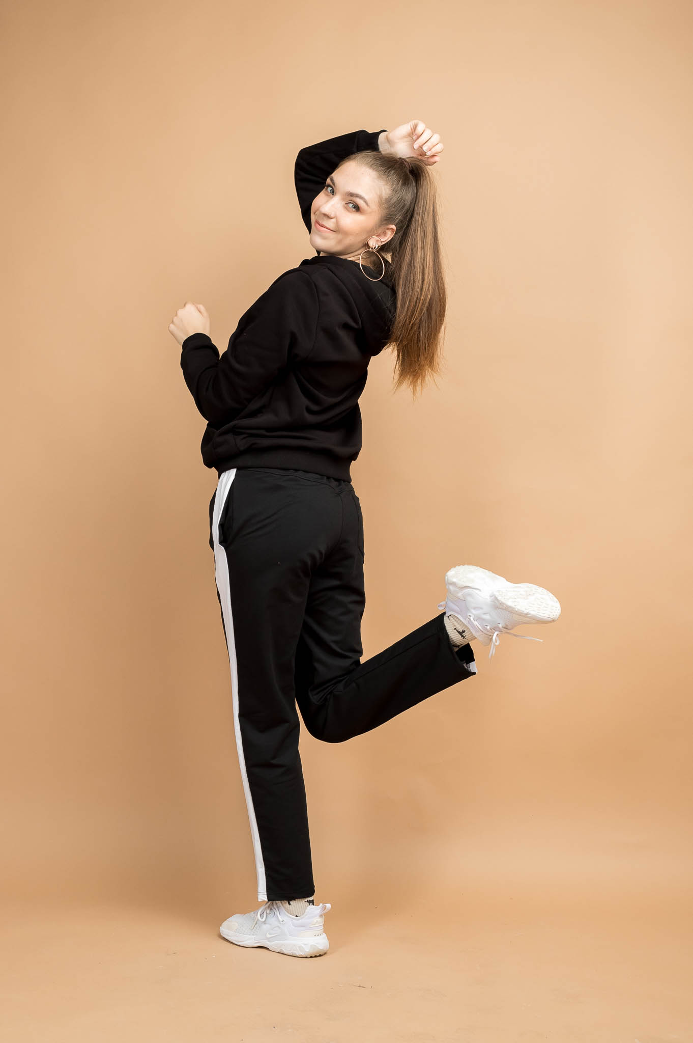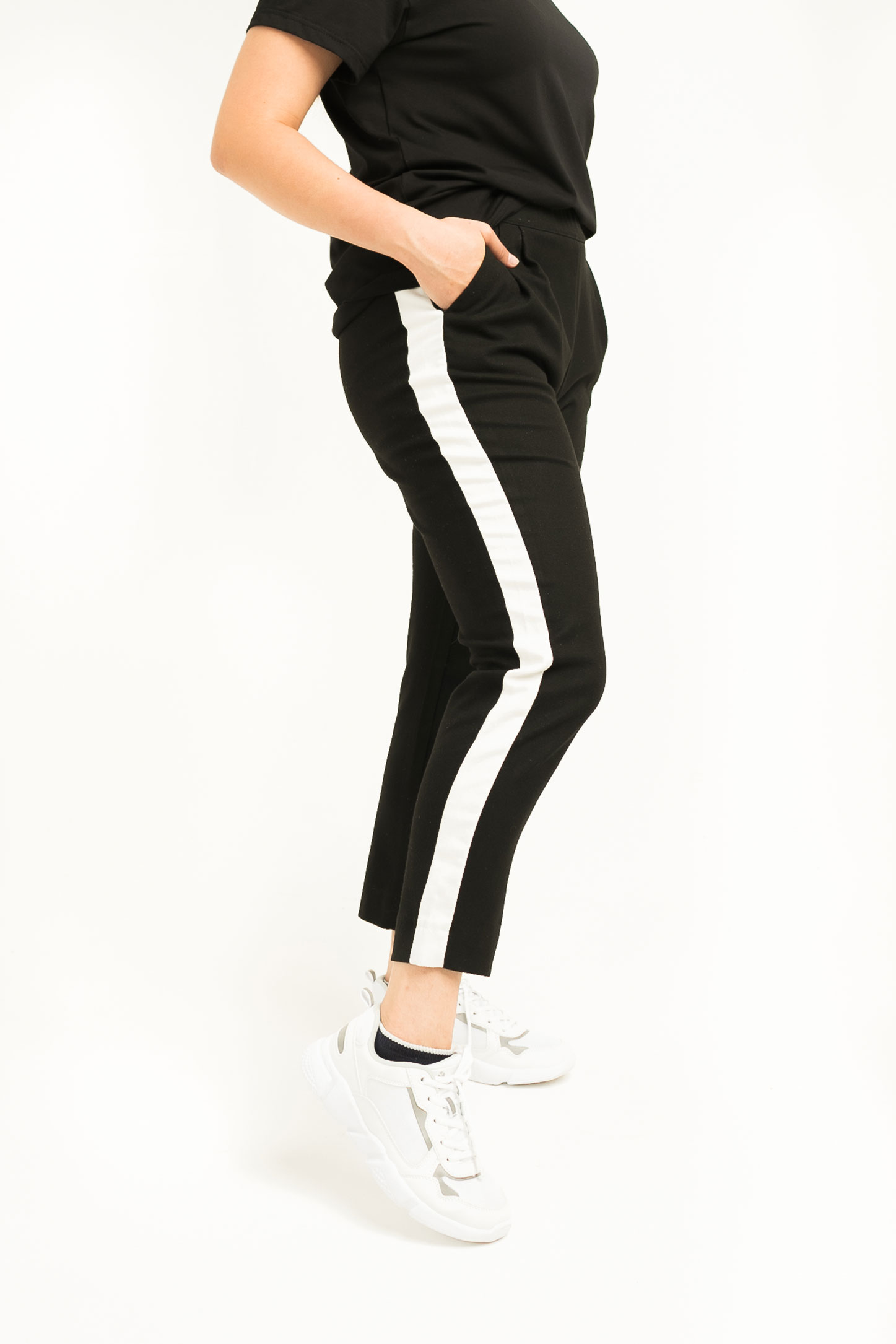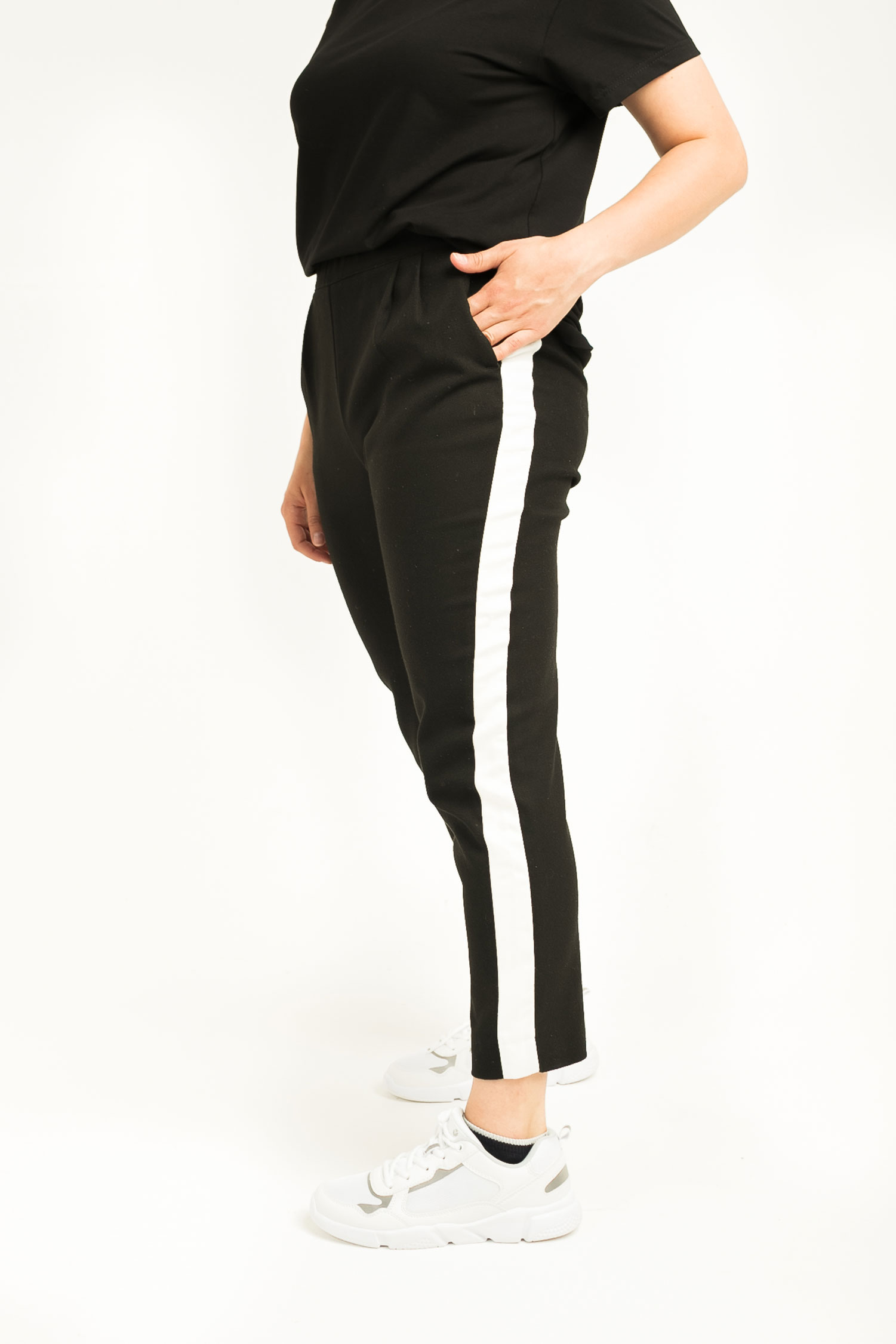 На задней половинке брюк расположена кокетка с отстрочкой шириной 0,5 см. На правой половинке — накладной фигурный карман. На передней половинке — контрастные лампасы, в боковых швах расположены карманы. Низ штанин обработан в подгибку на плоскошовной машине.