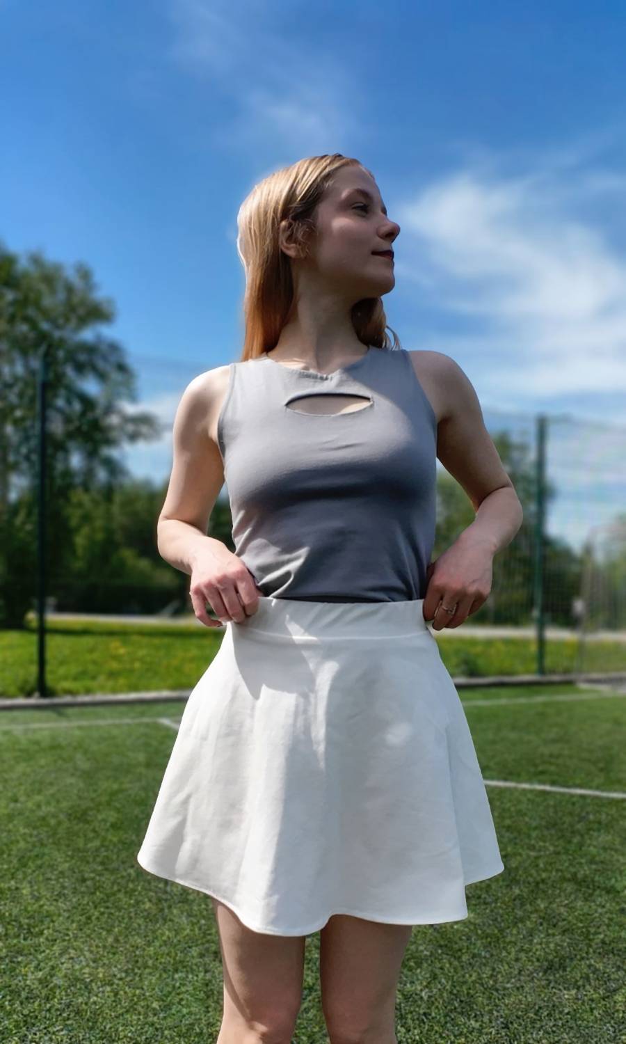 Нижняя часть представляет собой плотно облегающие шорты короткой длины, обработанные на плоскошовной машине с подгибом в 2 см — это гарантирует аккуратный и прочный шов. Верхняя часть изделия выполнена в виде юбки-полусолнца, длина которой выше колена, что позволяет носить её как мини-юбку. Такая конструкция делает модель универсальной и подходящей для разных стилей и активностей.