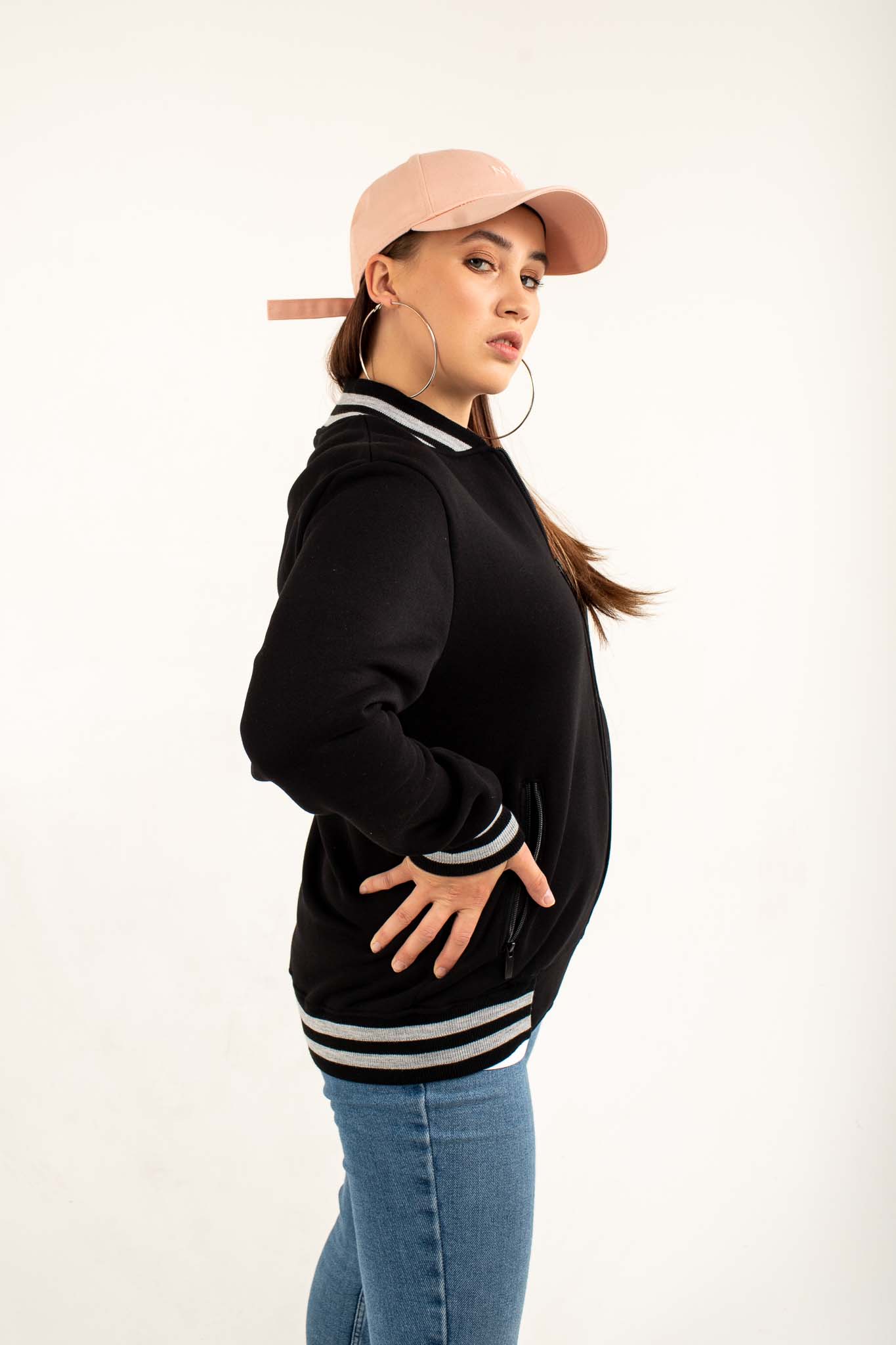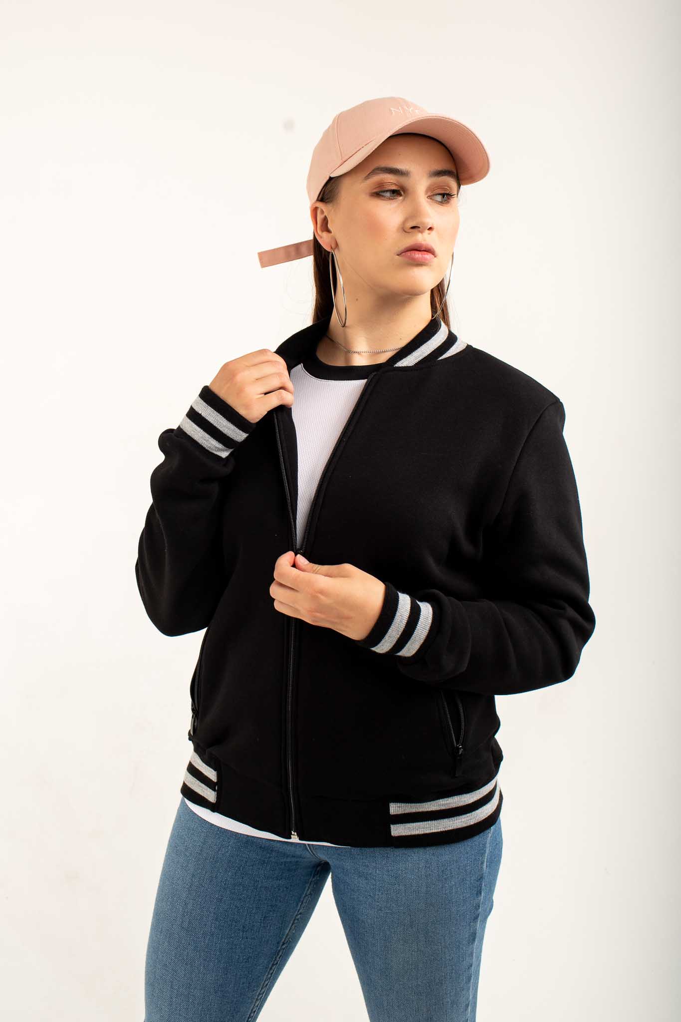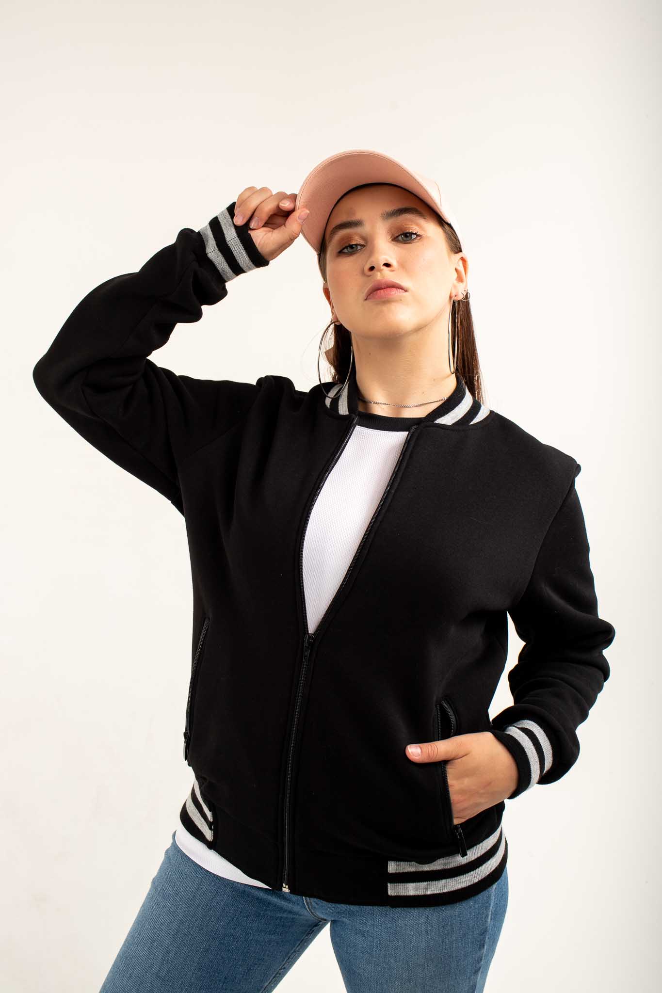 Куртка Бомбер NarpiLed прямого кроя с втачным рукавом с естественной линией плеча, на полочке прорезные карманы с листочкой, застежка цельнокроеная планка на металлических кнопках. Воротник-стойка с фигурными концами, низ рукава и пояс изделия из полосатого вязанного трикотажного подвяза. Шов втачивания воротника усилен киперной лентой, отсрочки шириной 0,5 см по краю планки и низу изделия, карманы отстрочены ширина шва 0,1 см. Длина изделия укороченная до линии бедер.