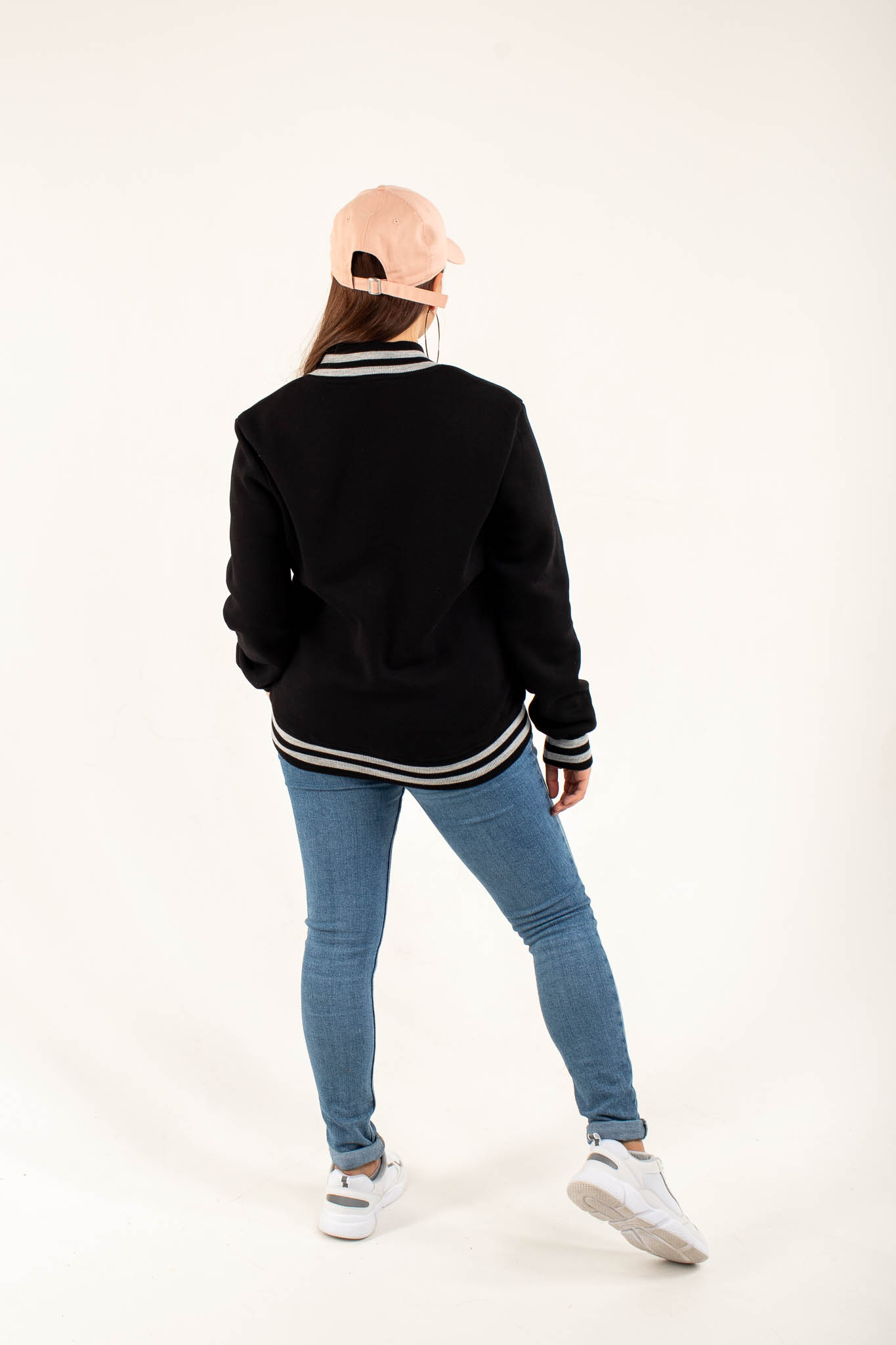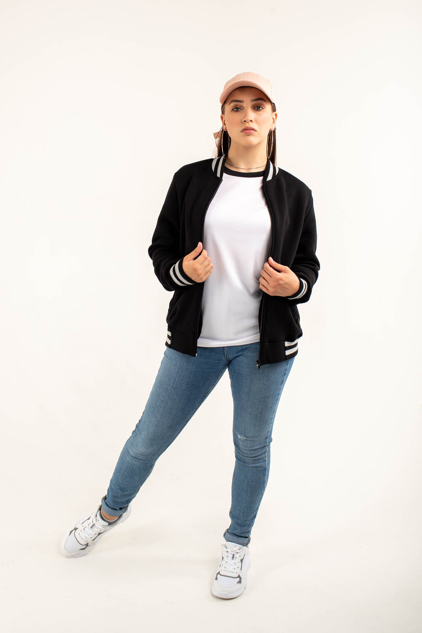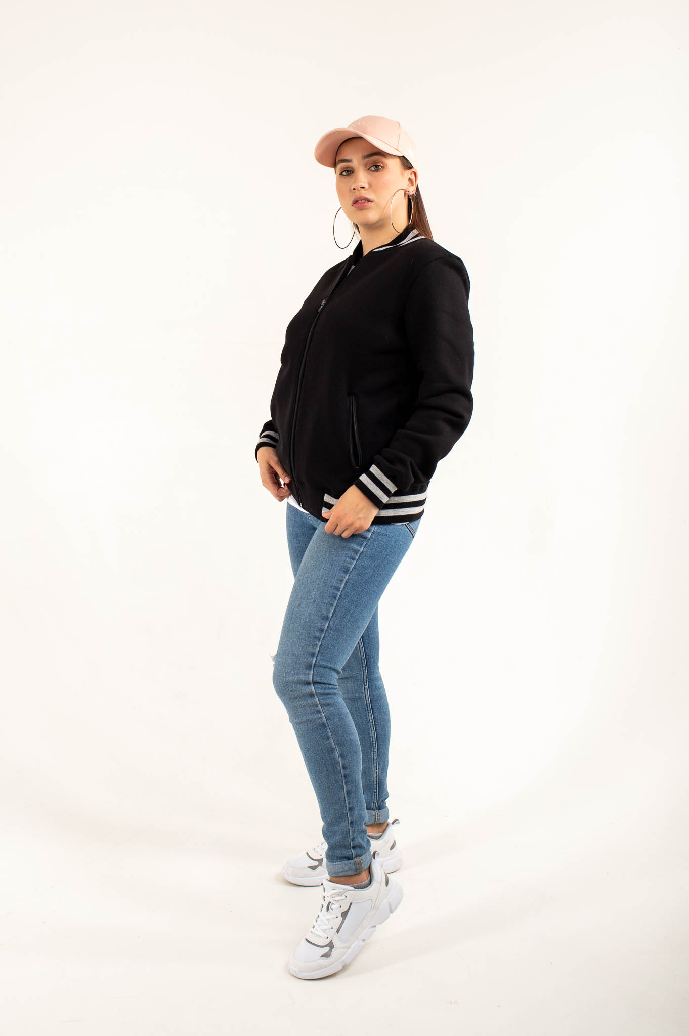 Куртка Бомбер NarpiLed прямого кроя с втачным рукавом с естественной линией плеча, на полочке прорезные карманы с листочкой, застежка цельнокроеная планка на металлических кнопках. Воротник-стойка с фигурными концами, низ рукава и пояс изделия из полосатого вязанного трикотажного подвяза. Шов втачивания воротника усилен киперной лентой, отсрочки шириной 0,5 см по краю планки и низу изделия, карманы отстрочены ширина шва 0,1 см. Длина изделия укороченная до линии бедер.