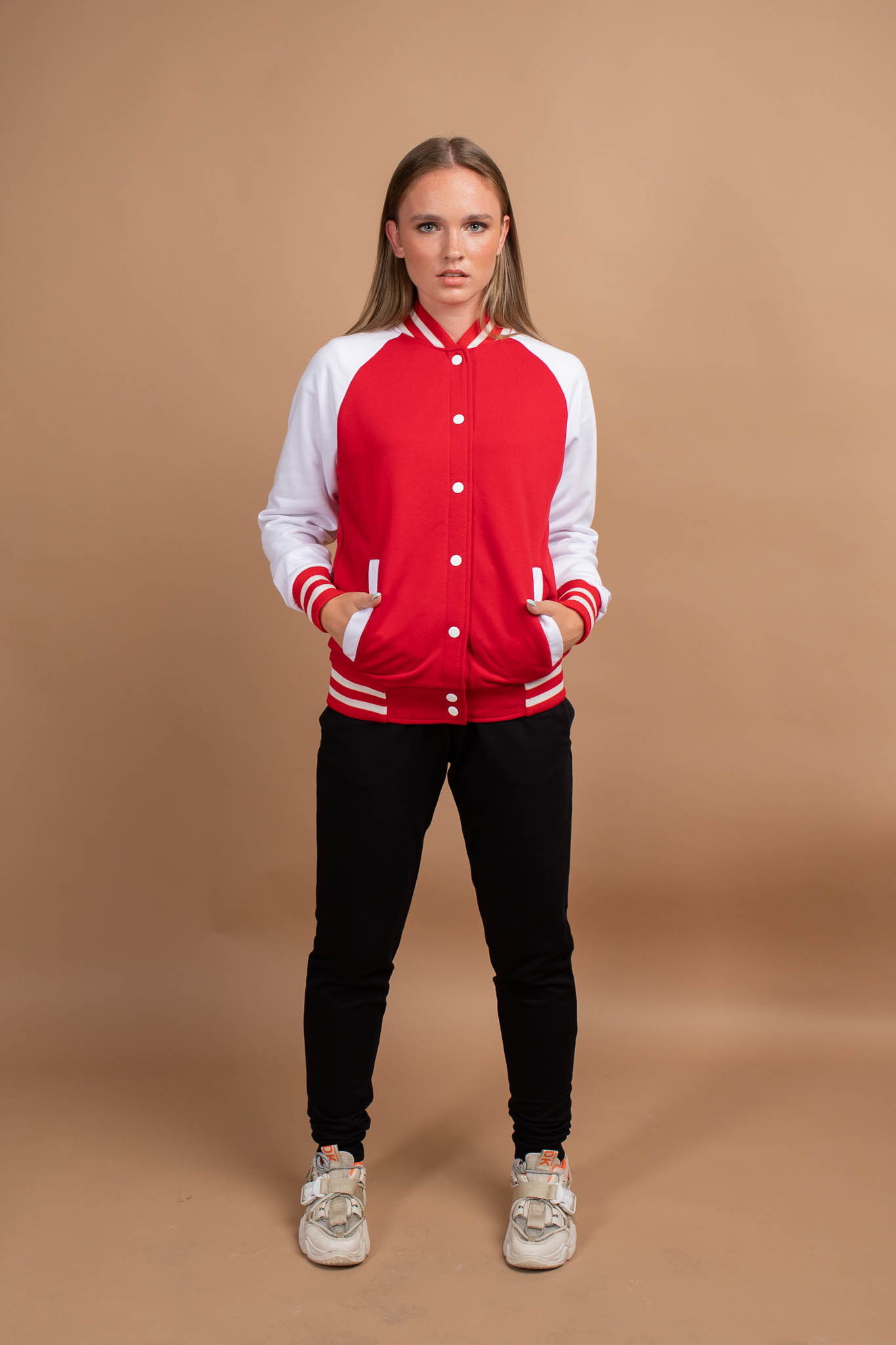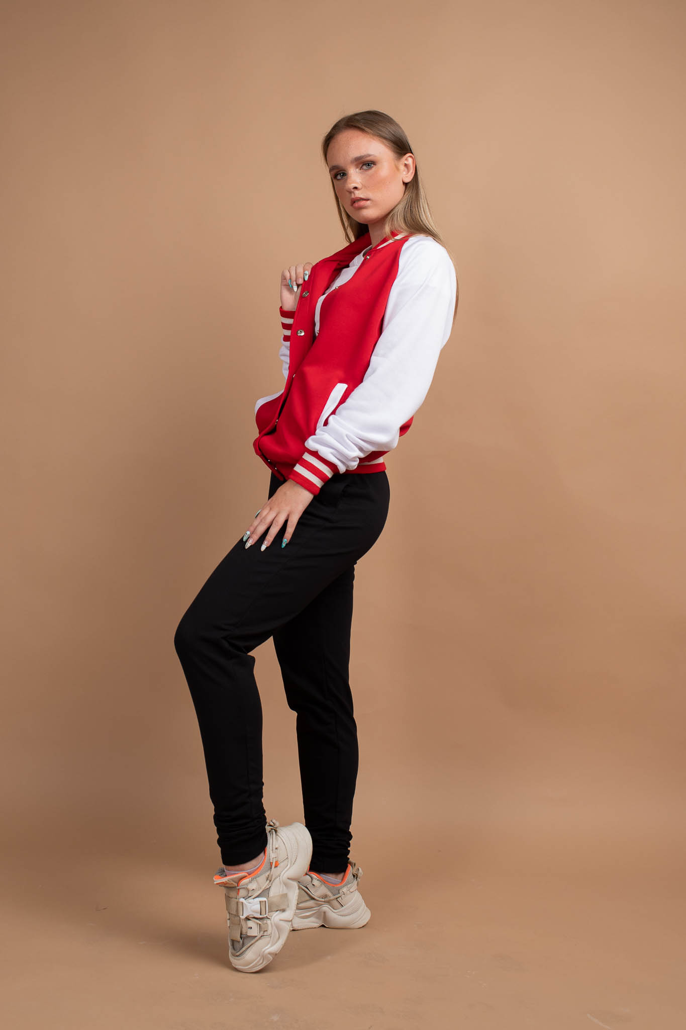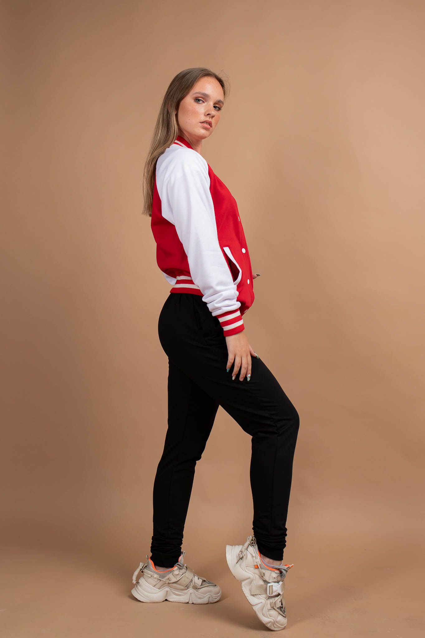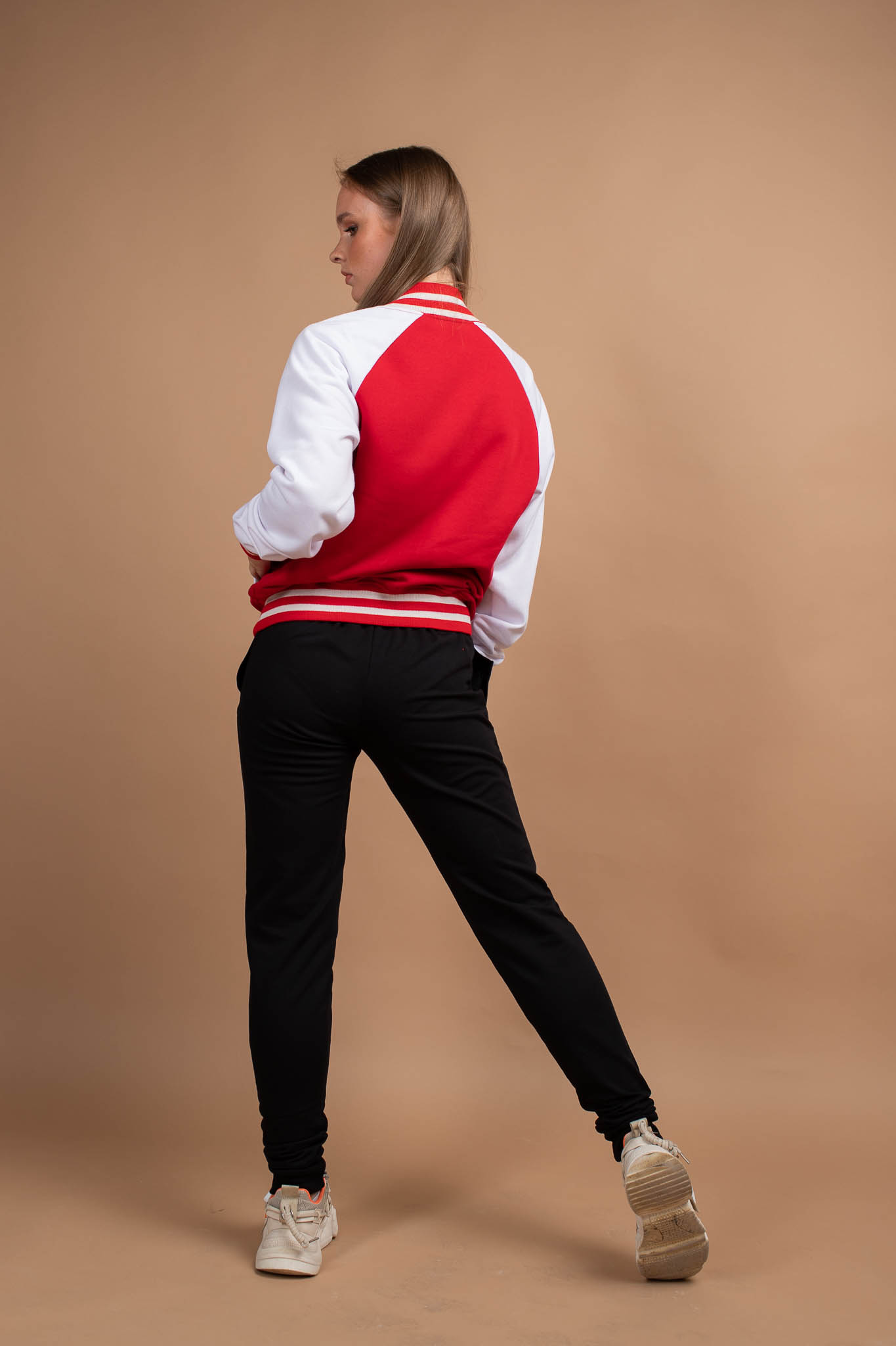 Куртка BomberStyle прямого кроя с рукавом реглан с естественной линией плеча, на полочке прорезные карманы с листочкой, застежка цельнокроеная планка на металлических кнопках. Воротник-стойка с фигурными концами, низ рукава и пояс изделия из полосатого вязанного трикотажного подвяза. Шов втачивания воротника усилен киперной лентой, отсрочки шириной 0,5 см по краю планки и низу изделия, карманы отстрочены ширина шва 0,1 см. Длина изделия укороченная до линии бедер.