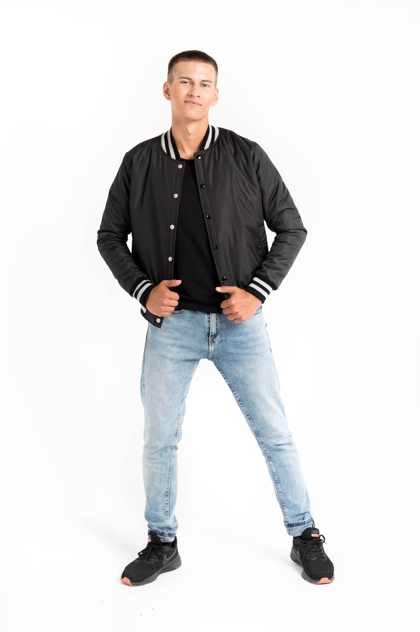 Куртка Bomber PRINCE - прямого кроя с втачным рукавом с естественной линией плеча, с утеплителем из синтепона и подкладом, верх выполнен из плащевой ткани. Полочка имеет прорезные карманы с листочкой, застежка — цельнокроеная планка на металлических кнопках. Воротник-стойка с фигурными концами из трикотажного подвяза, низ рукавов обработан манжетой, низ изделия закрыт поясом так же из трикотажного подвяза. Декоративная отсрочка шириной 0,5 см по краю планки и низу изделия, карманы отстрочены ширина шва 0,1 см. Длина изделия укороченная до линии бедер.