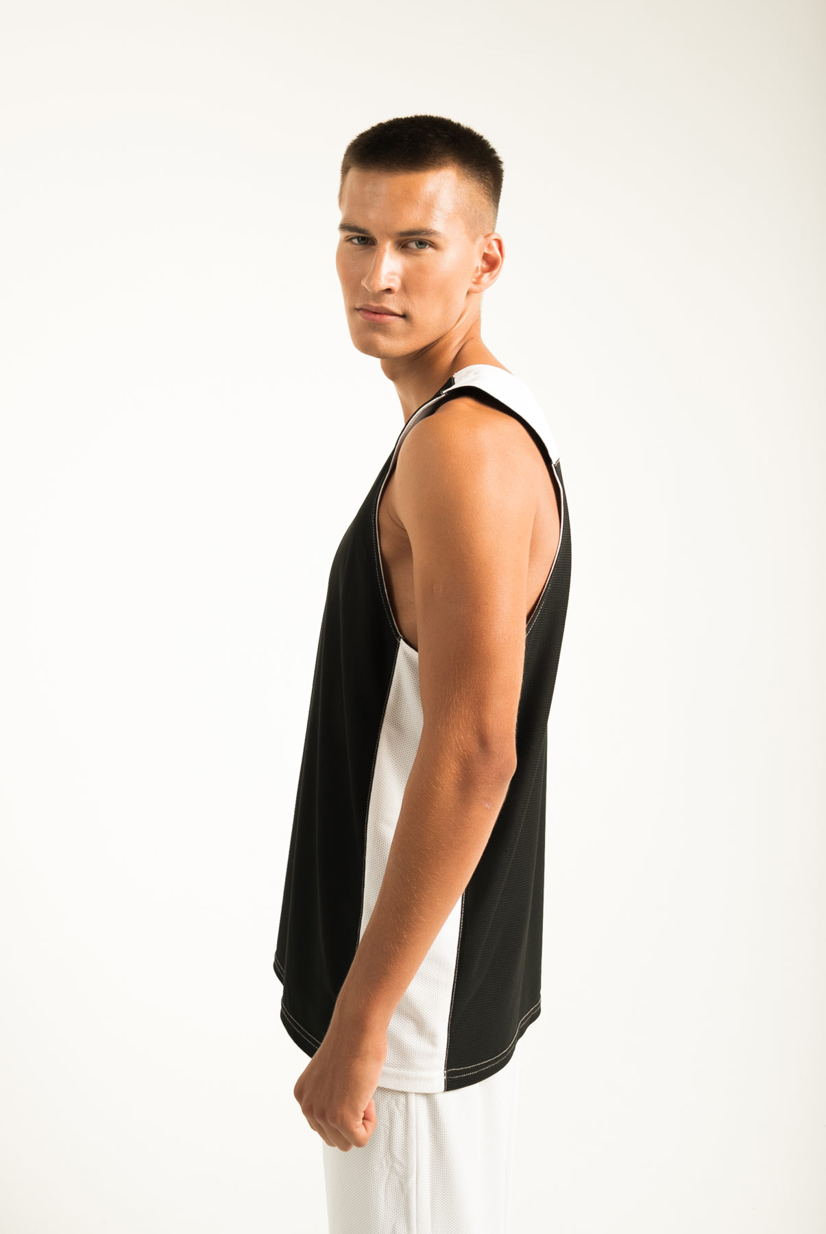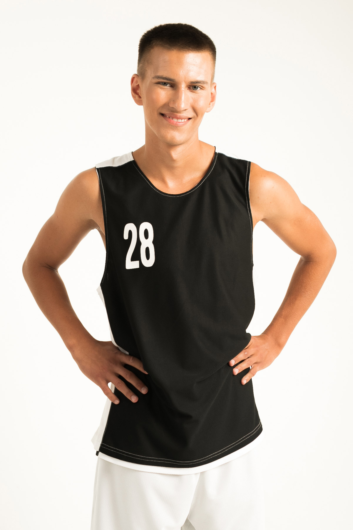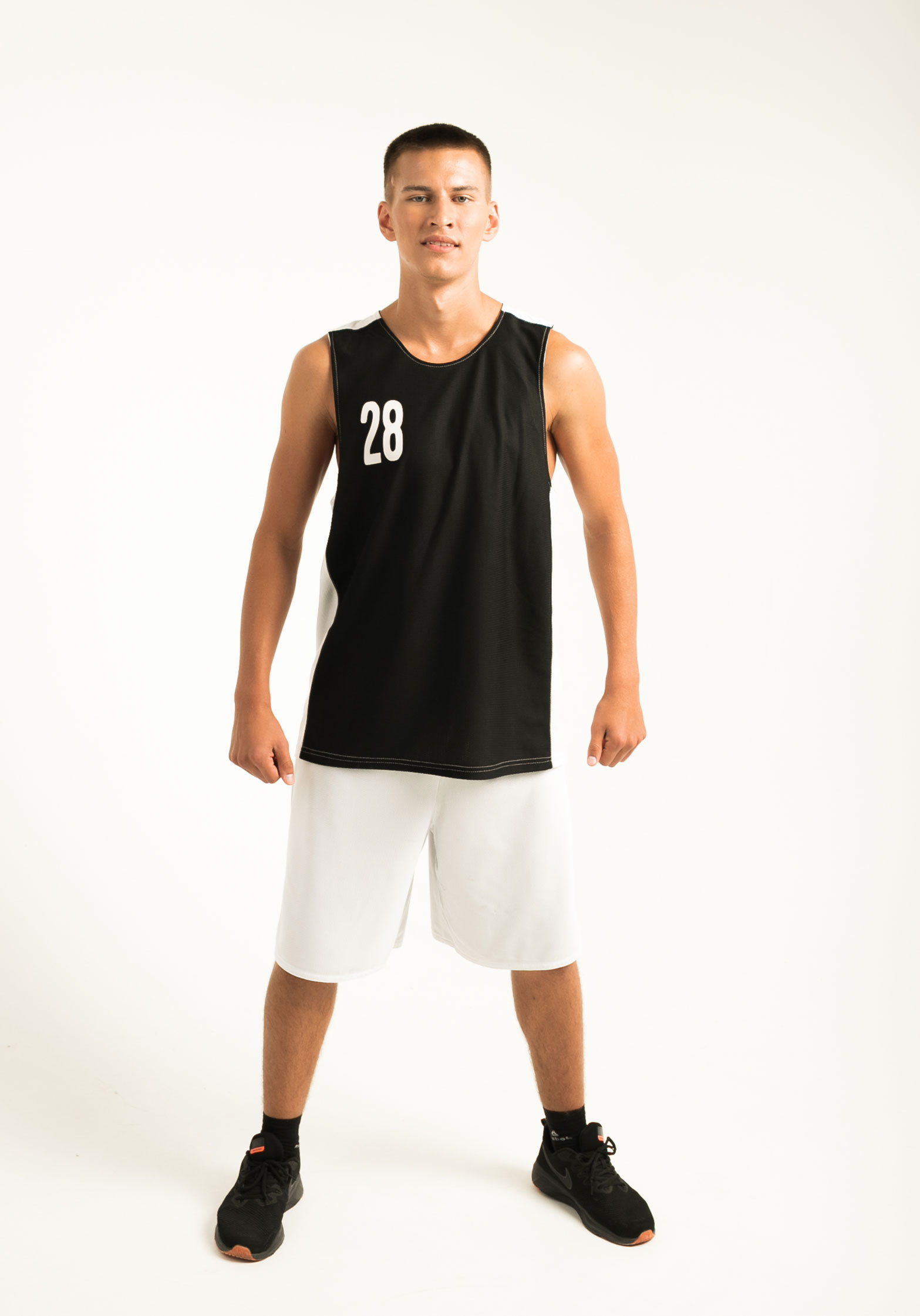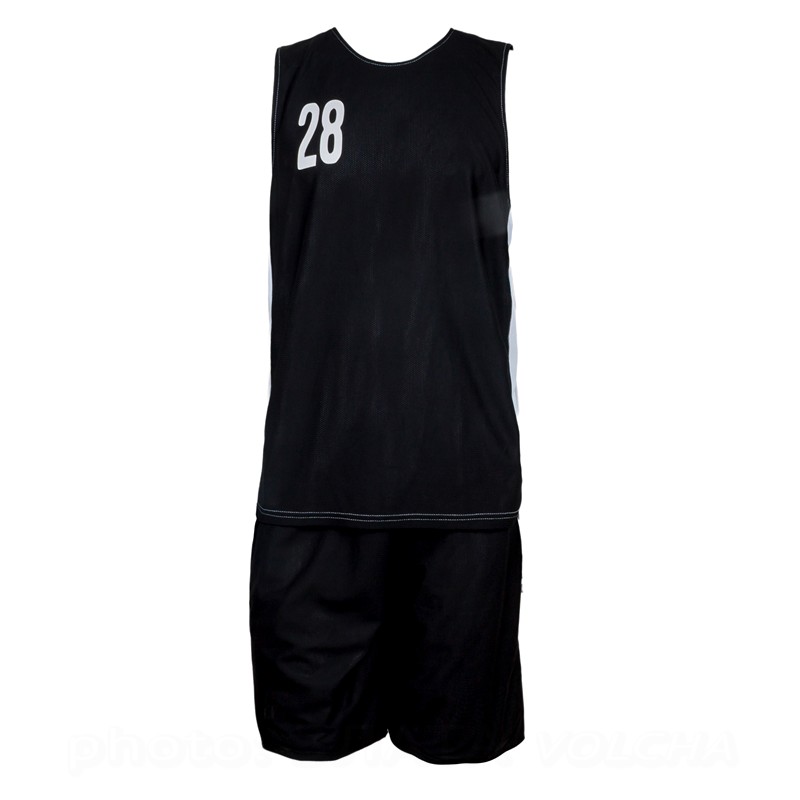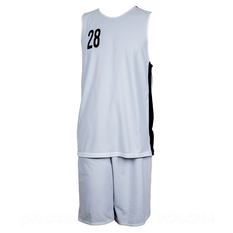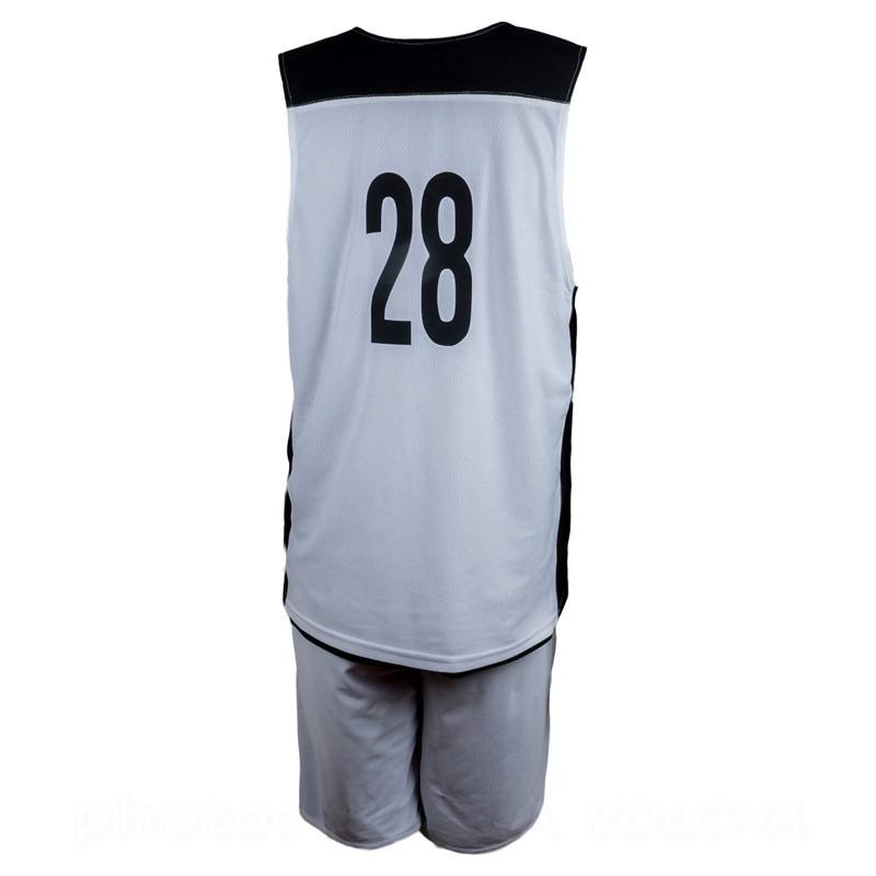 Баскетбольная форма двухсторонняя, комбинированная. Одна сторона белая, вторая черная. Комбинировать возможно в различных вариациях: шорты черные/майка белая, шорты белые/майка черная, или сделать одноцветный вариант. Структура ткани в мелкую "дырочку", используемой при пошиве, позволяет спортсмену чувствовать себя комфортно даже при очень высоких физических нагрузках.