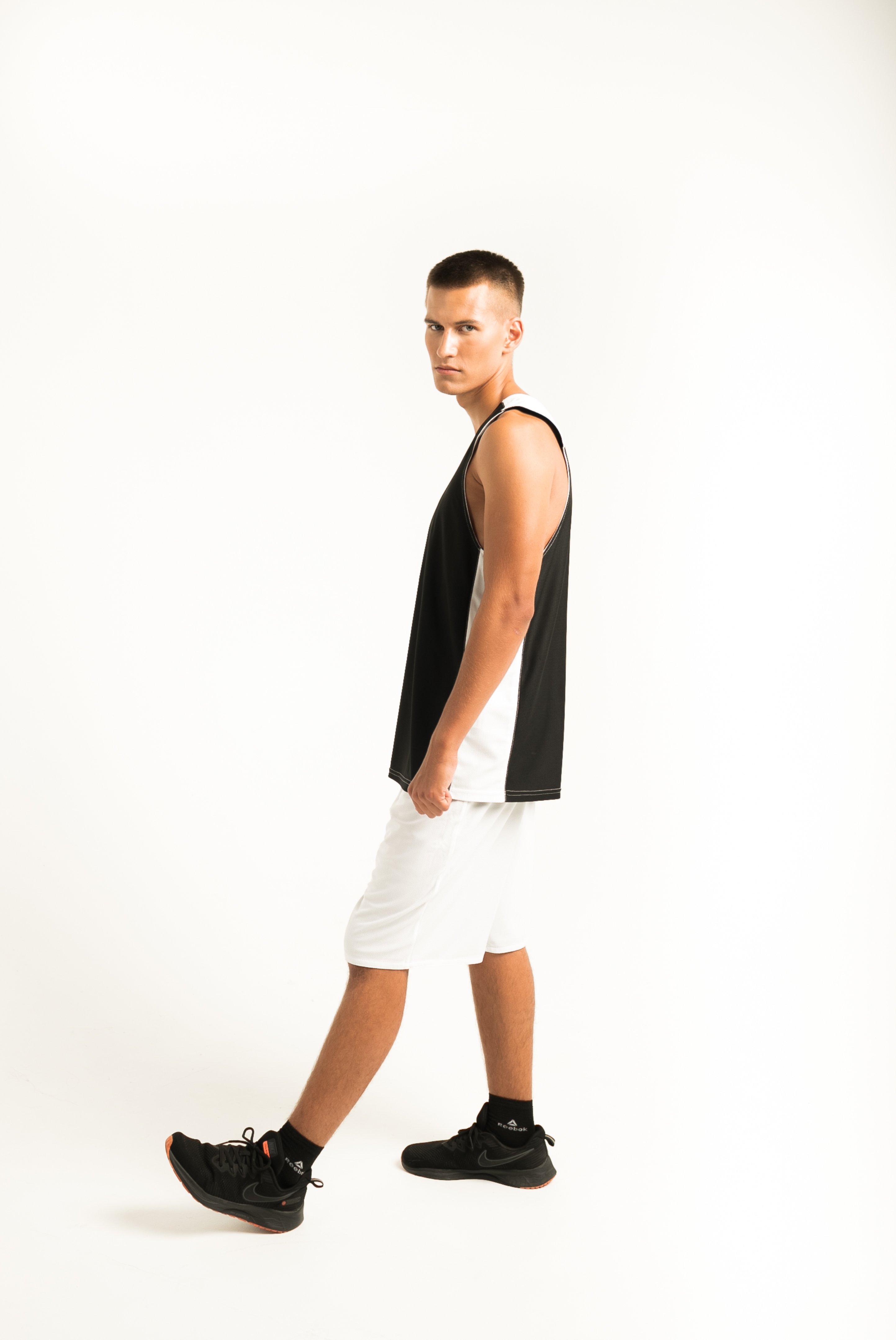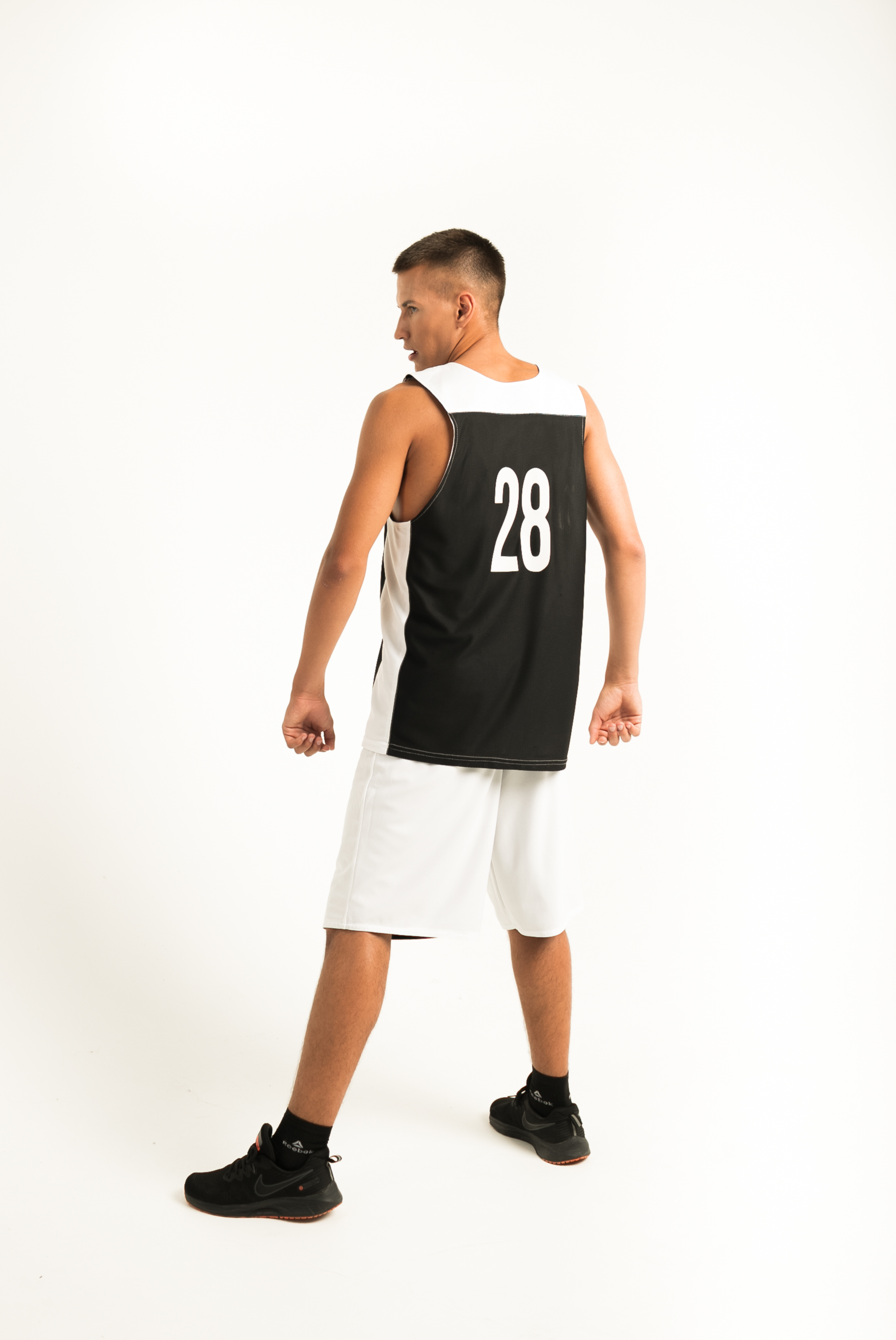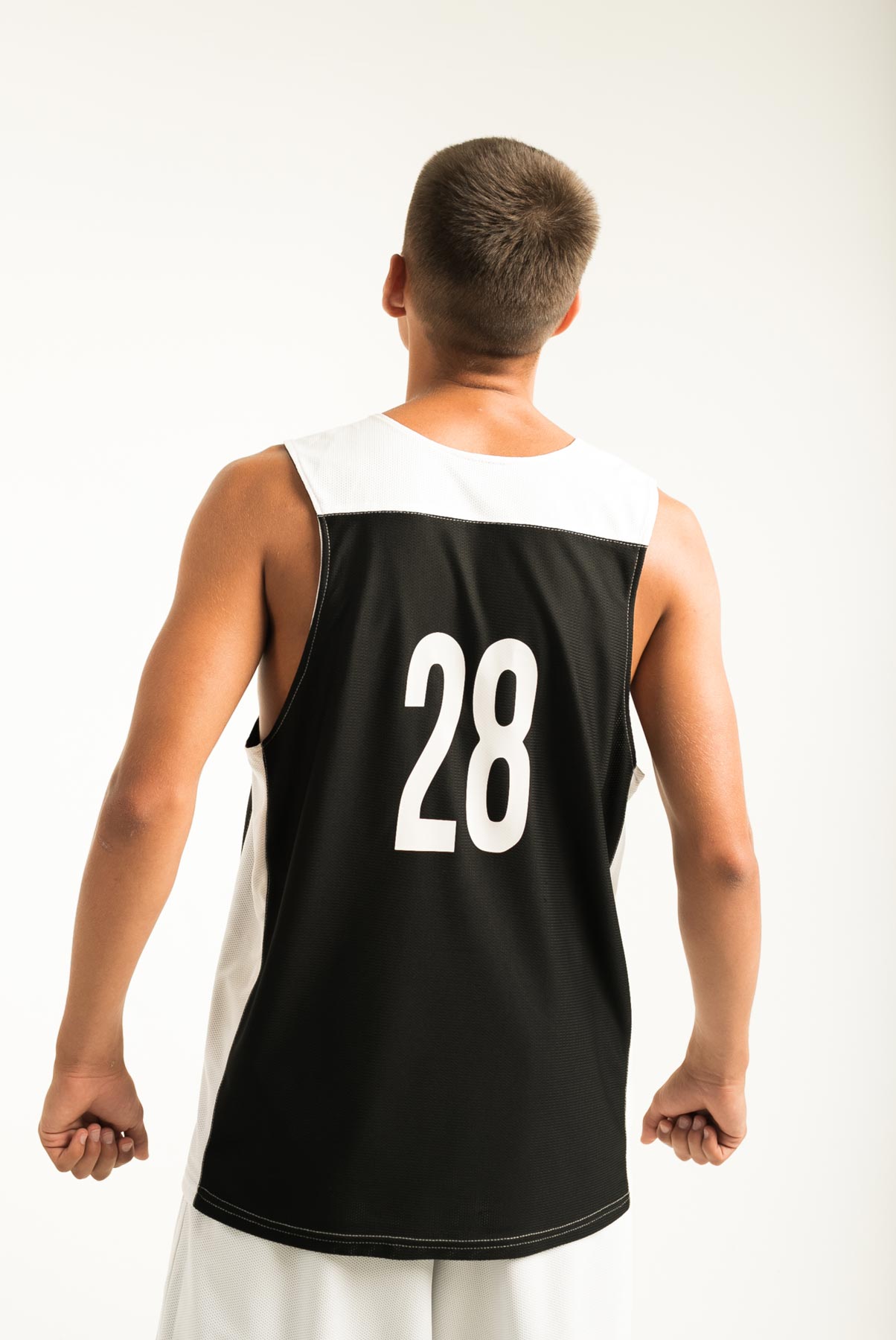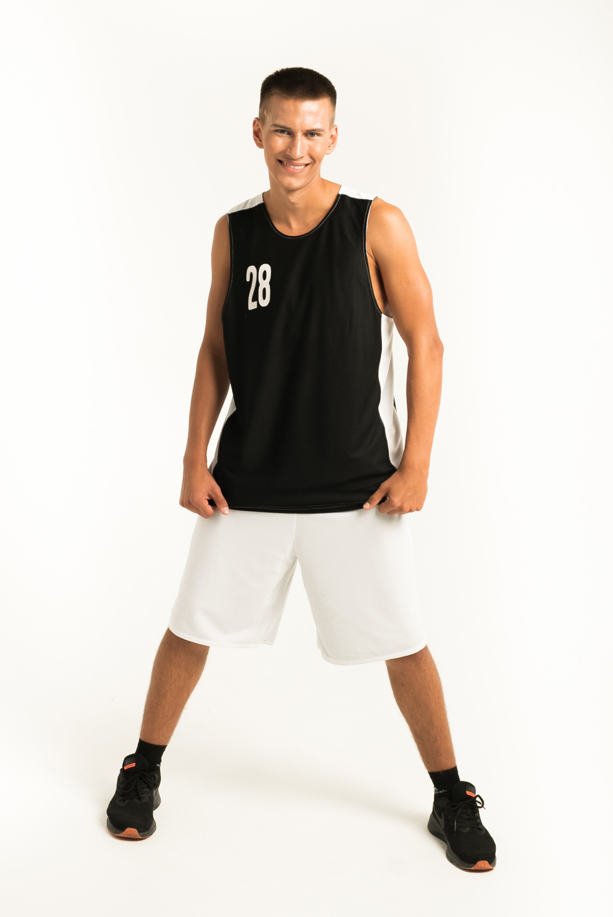 Баскетбольная форма двухсторонняя, комбинированная. Одна сторона белая, вторая черная. Комбинировать возможно в различных вариациях: шорты черные/майка белая, шорты белые/майка черная, или сделать одноцветный вариант. Структура ткани в мелкую "дырочку", используемой при пошиве, позволяет спортсмену чувствовать себя комфортно даже при очень высоких физических нагрузках.