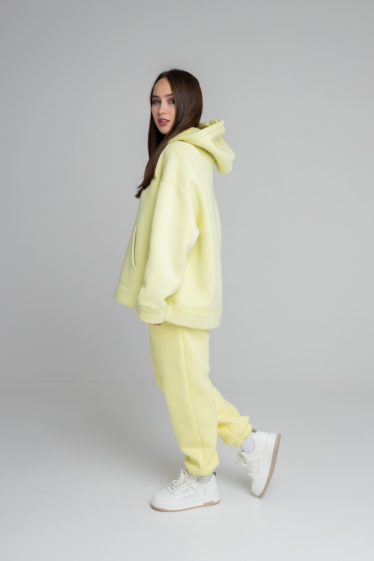 Комплект состоит из худи оверсайз с капюшоном и карманом-кенгуру и штанов из мягкого футера. Модель худи выполнена в стиле оверсайз — свободный крой обеспечивает комфорт и современный вид, что особенно востребовано в мерче и молодежной одежде.