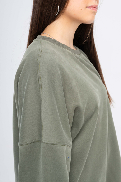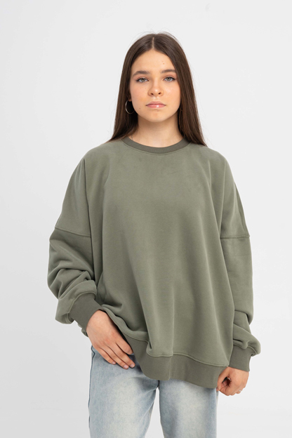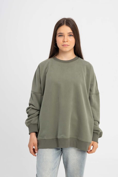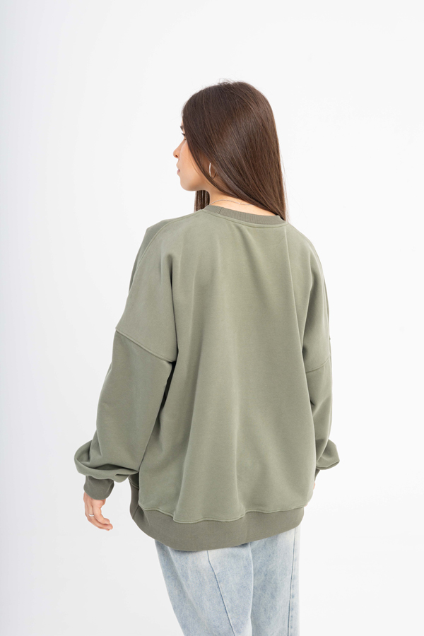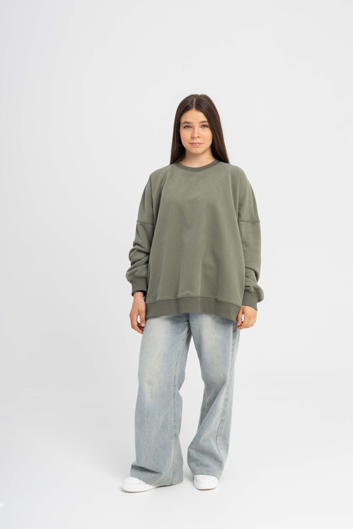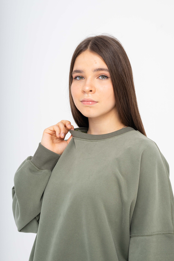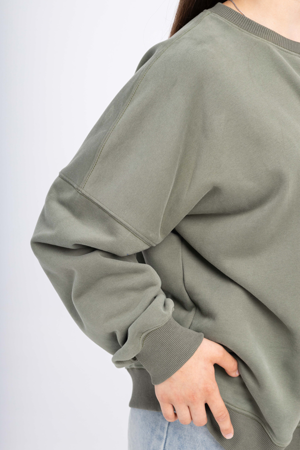 Прямой силуэт длиной до середины бедра и удлиненная линия плеча обеспечивают свободный и расслабленный вид. Горловина с обтачкой из кашкорсе и манжеты на рукавах шириной 7 см придают изделию аккуратный и модный вид. Низ свитшота оформлен притачным поясом, а все швы выполнены на плоскошовной машине для повышенной прочности.