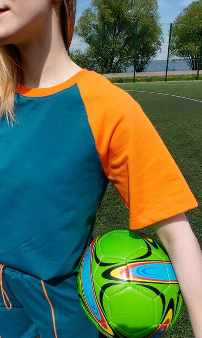 Горловина аккуратно обработана бейкой из рибаны шириной 2 см, а отстрочка по переду выполнена на 0,5 см — это придаёт футболке стильный и современный вид. Шов горловины по спинке закрыт киперной лентой, что улучшает внешний вид и долговечность изделия.