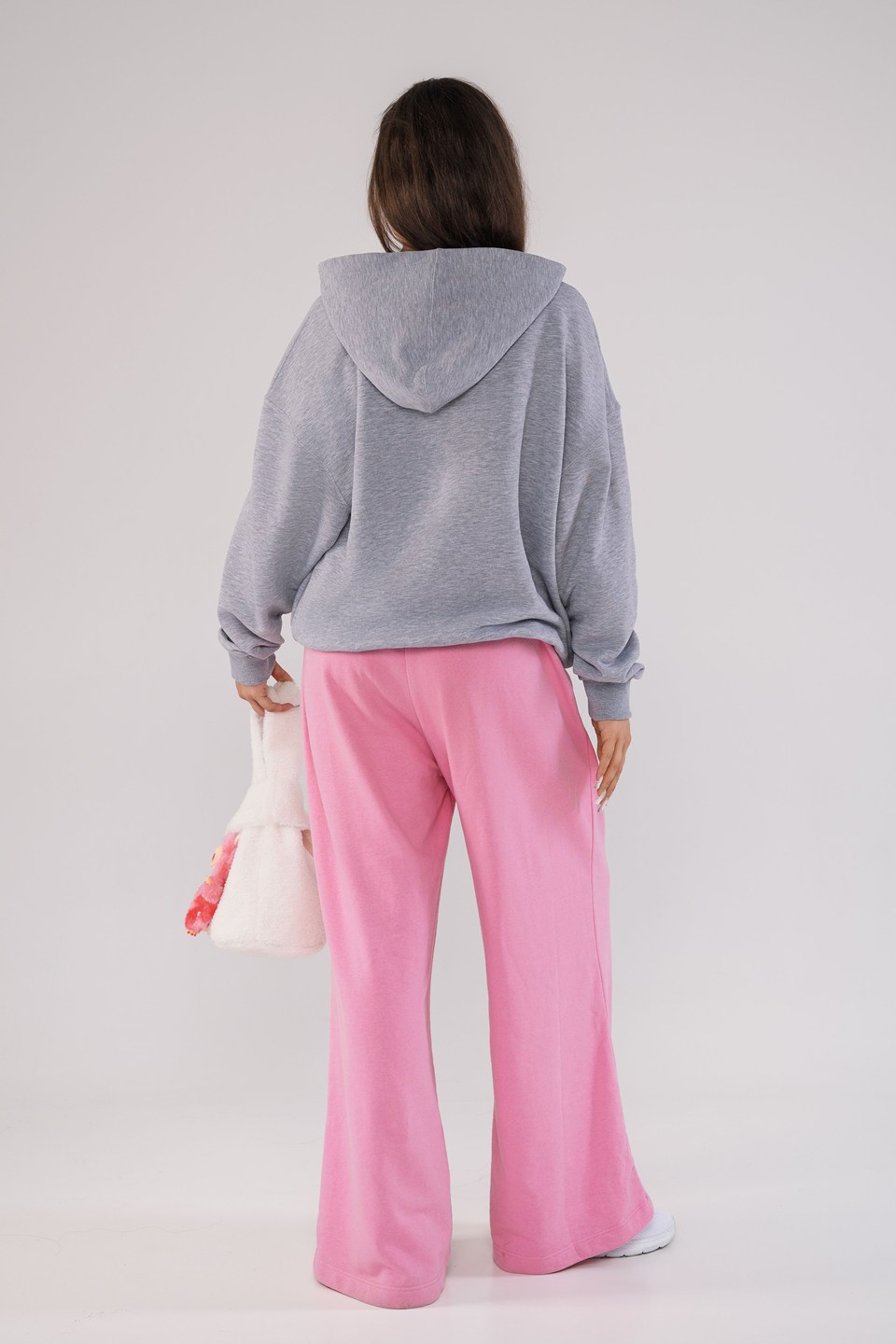 Низ изделия обработан плотно прилегающим притачным поясом из кашкорсе, а низ рукавов — притачными манжетами из того же материала. Это придаёт худи законченный и аккуратный вид. Отстрочка на специальной машине с раздвижкой шва по плечевому шву, пройме и поясу подчёркивает качество и изящество изделия.