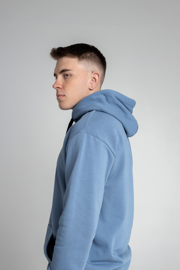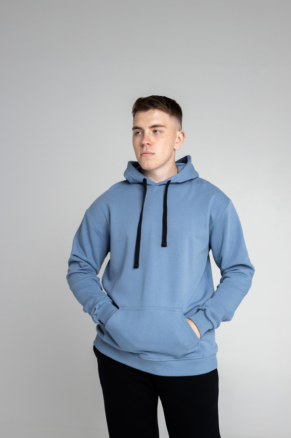 Толстовка Худи CLASSIC - Худи прямого классического кроя, на полочке накладной карман «кенгуру». Горловина имеет втачной капюшон из 2/3-х деталей с подкладкой из основной ткани, имеет кулиску со шнуром, вставленным в выметанные петли. Верхний капюшон отстрочен по швам стачивания капюшона ширина шва 0,5 см. По низу изделия пояс из кашкорсе. Рукав втачной с естественной линией плеча, низ обработан манжетой из кашкорсе. Шов горловины усилен киперной лентой, декоративная отстрочка ширина шва 0,5 см по горловине и поясу. Длина худи до середины бедра.