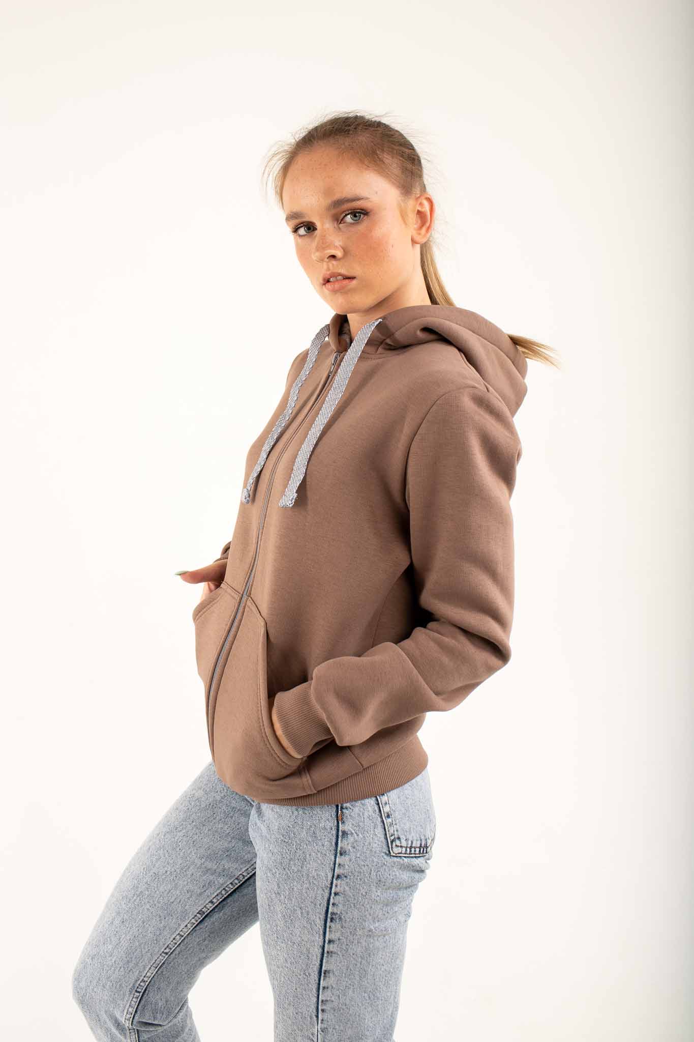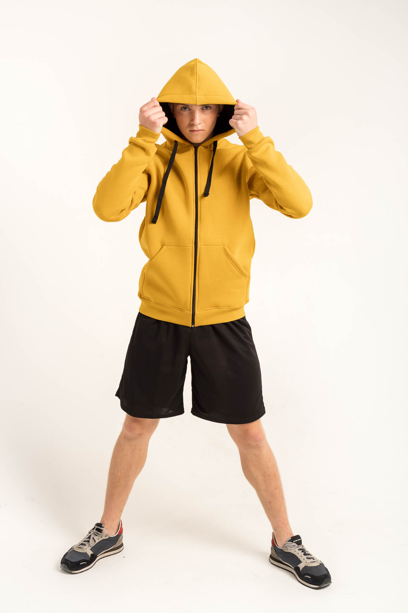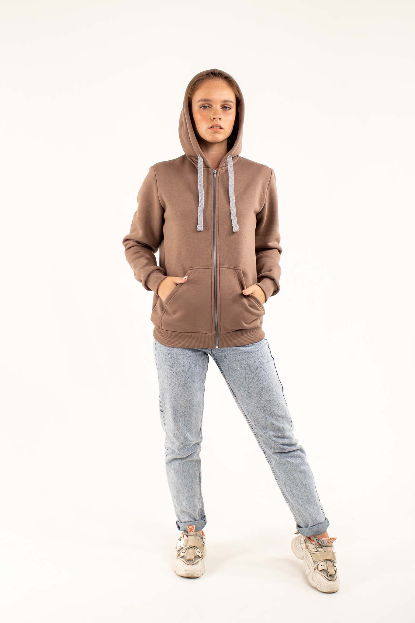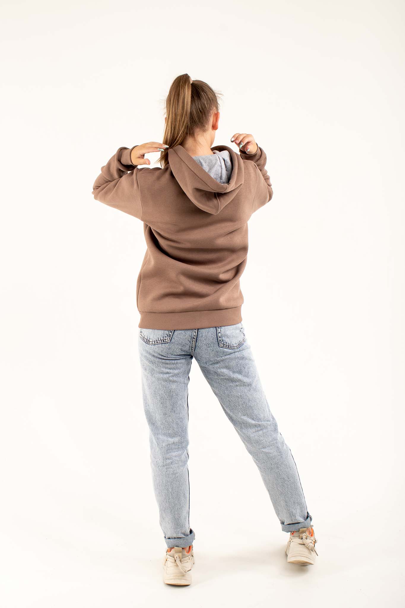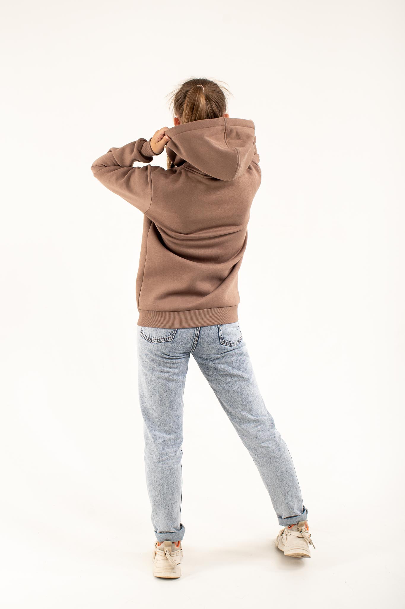 Верхняя часть капюшона отстрочена по среднему шву шириной 0,5 см — это подчёркивает аккуратность пошива. Застёжка на молнию также отстрочена с шириной шва 0,5 см, обеспечивая прочность и эстетичный вид. Длина изделия — до середины бедра, что делает худи универсальным: не слишком длинное, не слишком короткое — идеально для любого роста.