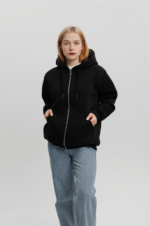 Откройте для себя сочетание стиля и уюта с нашей черной толстовкой из футера с начесом. Плотность ткани 320 г/м² обеспечивает непревзойденное тепло и комфорт, делая её идеальным выбором для прохладных дней. Элегантная металлическая молния добавляет изысканности, а накладные карманы и капюшон со шнурком придают практичность и функциональность. Рукава и низ, обработанные кашкорсе, гарантируют долговечность и идеальную посадку. Эта толстовка — не просто элемент гардероба, а надежный партнер, готовый согреть и поддержать в любой ситуации. Для оптовых заказчиков это отличный выбор, сочетающий высокое качество и привлекательный дизайн, который обязательно понравится вашим клиентам.