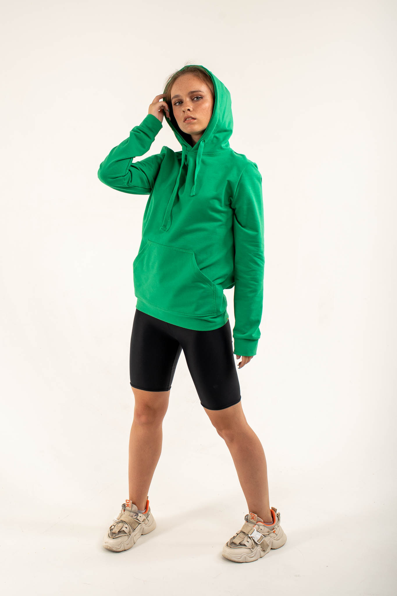 Шов горловины усилен киперной лентой — повышает долговечность и износостойкость. Декоративная отстрочка шириной 0,5 см по горловине и поясу добавляет изысканности и подчёркивает качество исполнения. Длина худи — до середины бедра, что делает его универсальным для разных комплекций.