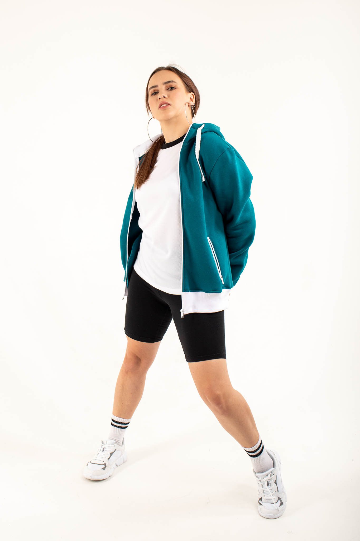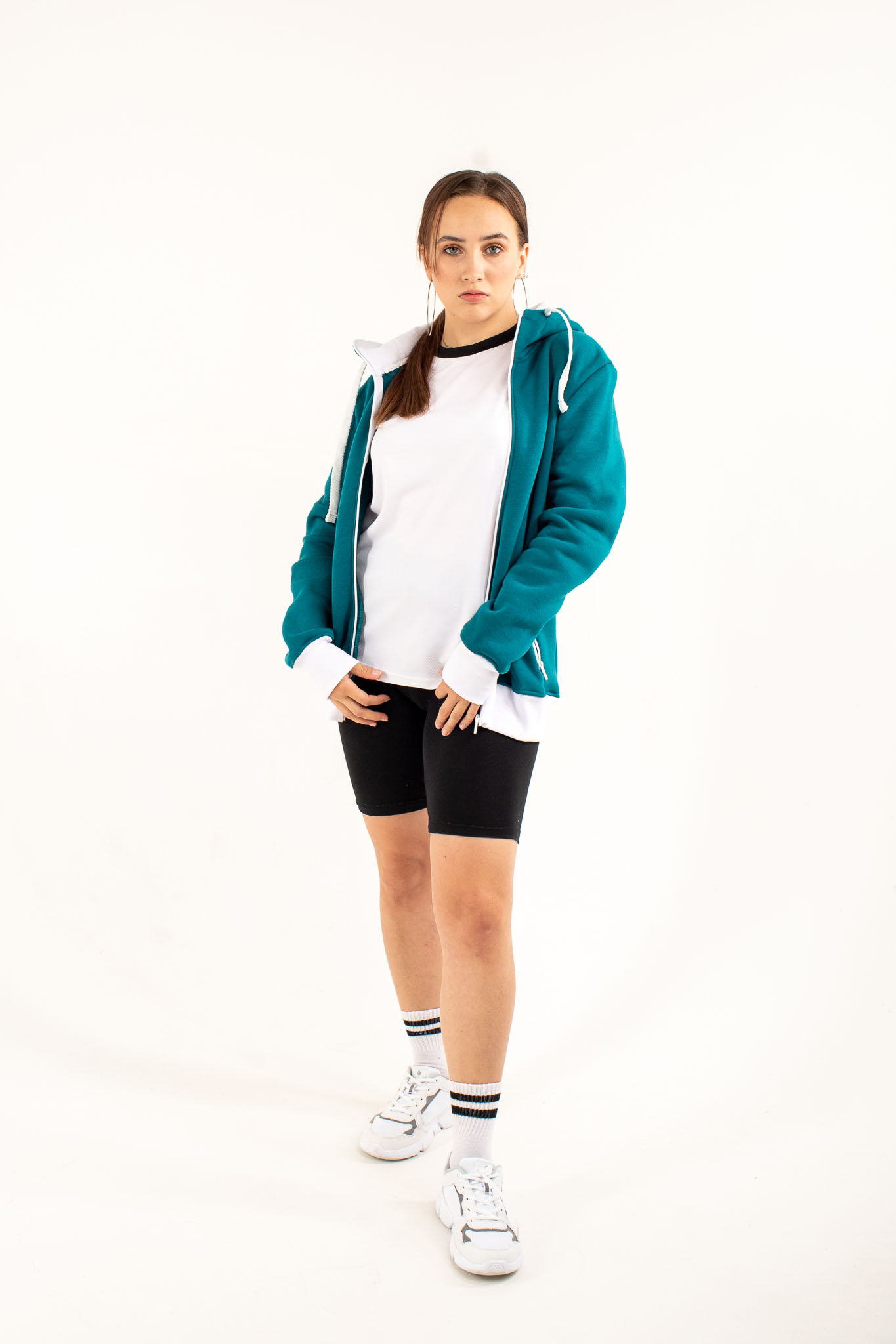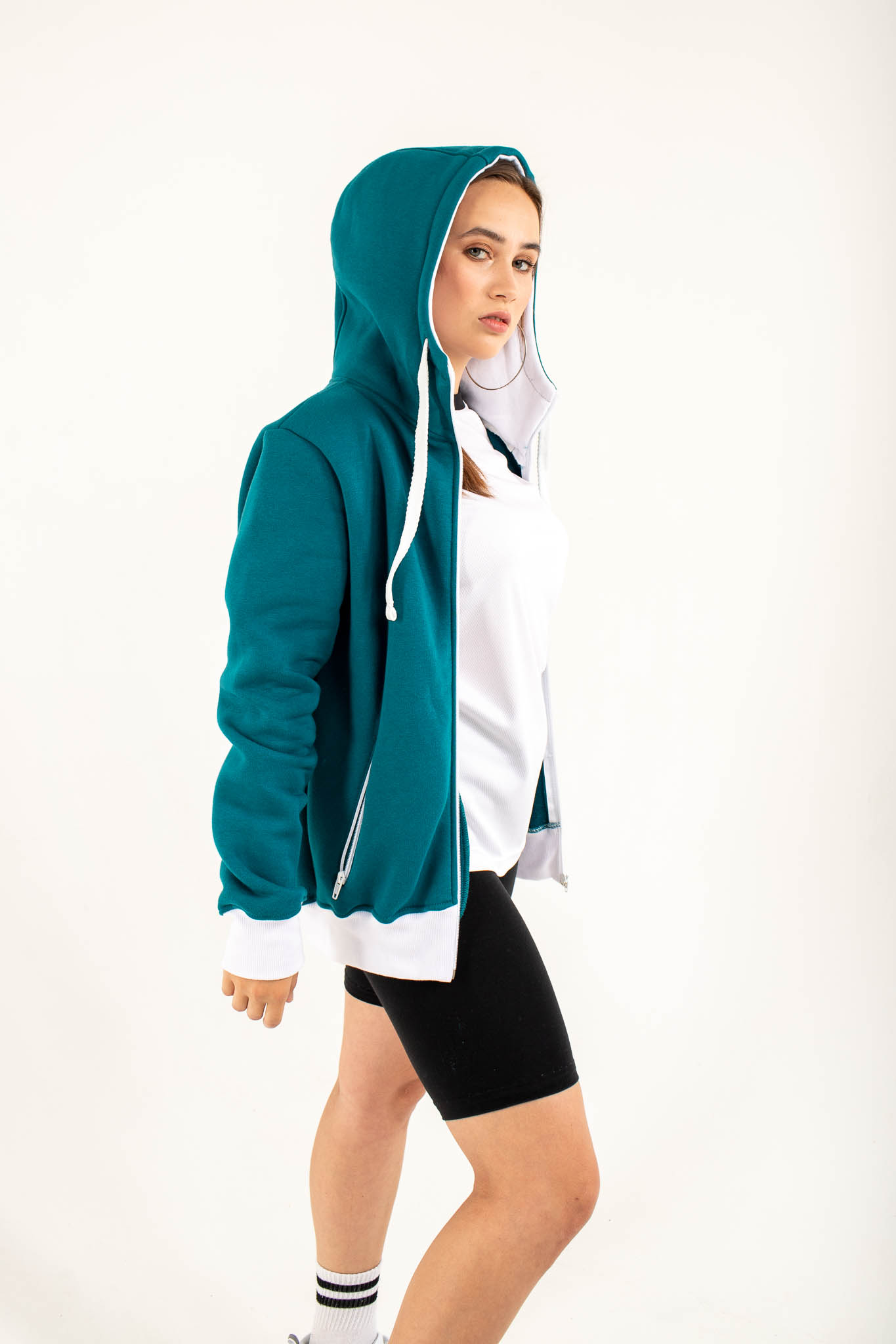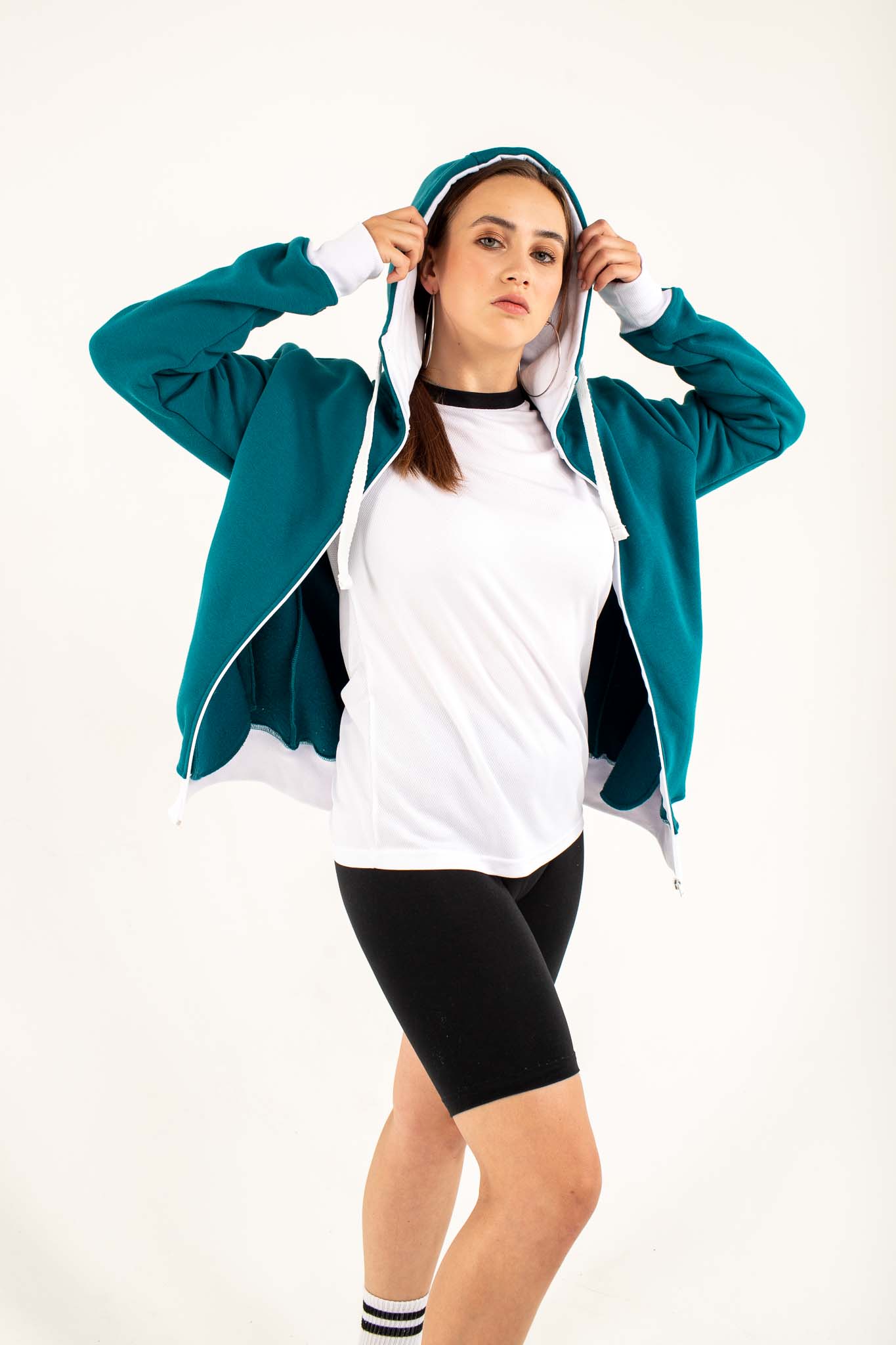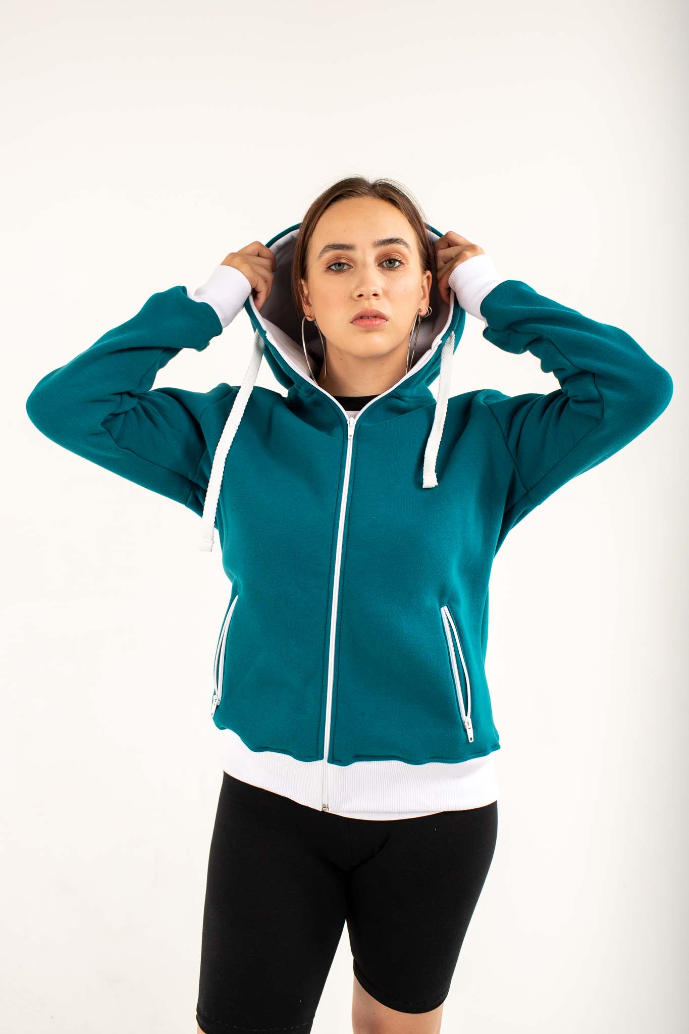 Капюшон — плотный, двухслойный, обеспечивает дополнительную защиту от ветра и холода. Низ и манжеты рукавов обработаны эластичным кашкорсе — в одном цвете с основой или в контрастном исполнении, что позволяет создавать яркие, запоминающиеся образы.
