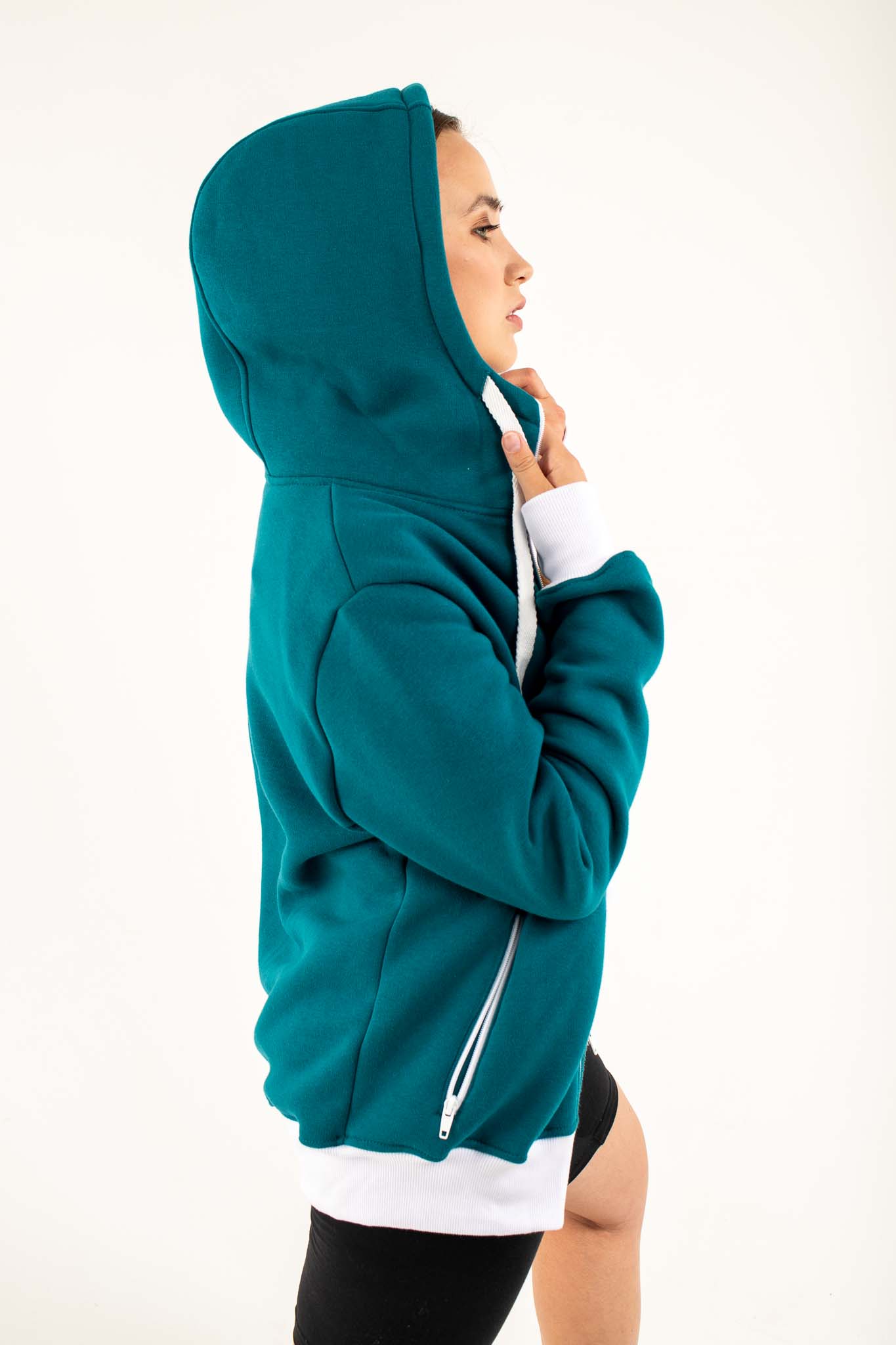 Прорезные карманы на молнии расположены по бокам — практичны, безопасны и стильно вписываются в силуэт. Застёжка на молнию — прочная, с отстрочкой, не стесняет движений и легко используется даже в перчатках.
