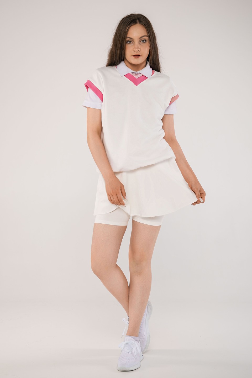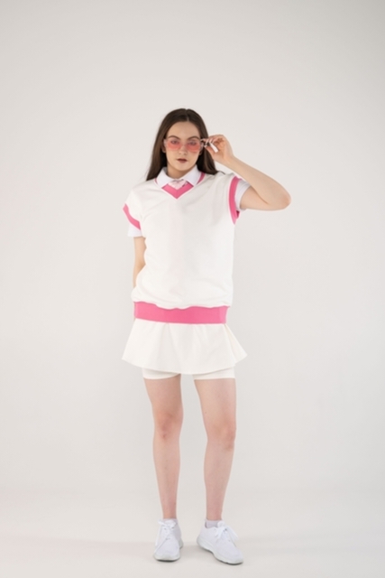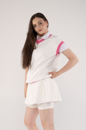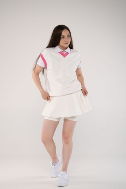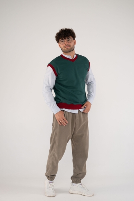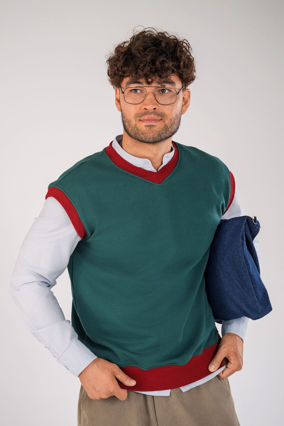 Горловина выполнена в виде V-образного выреза и отделана бейкой из кашкорсе контрастного оттенка шириной 5 см. Для усиления конструкции использована киперная лента, что гарантирует прочность и аккуратный внешний вид. Проймы и низ изделия также оформлены той же бейкой, что придаёт жилету завершённый и современный стиль.