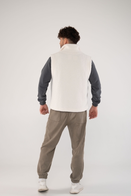 Центральная застёжка выполнена на кнопках и размещена на притачной планке из плащевой ткани, что придаёт жилету аккуратный и прочный вид. Горловина обработана воротником-стойкой из той же ткани, а проймы — обтачками с отстрочкой, ширина шва — 3,5 см. Такая обработка обеспечивает долговечность и эстетичный внешний вид.